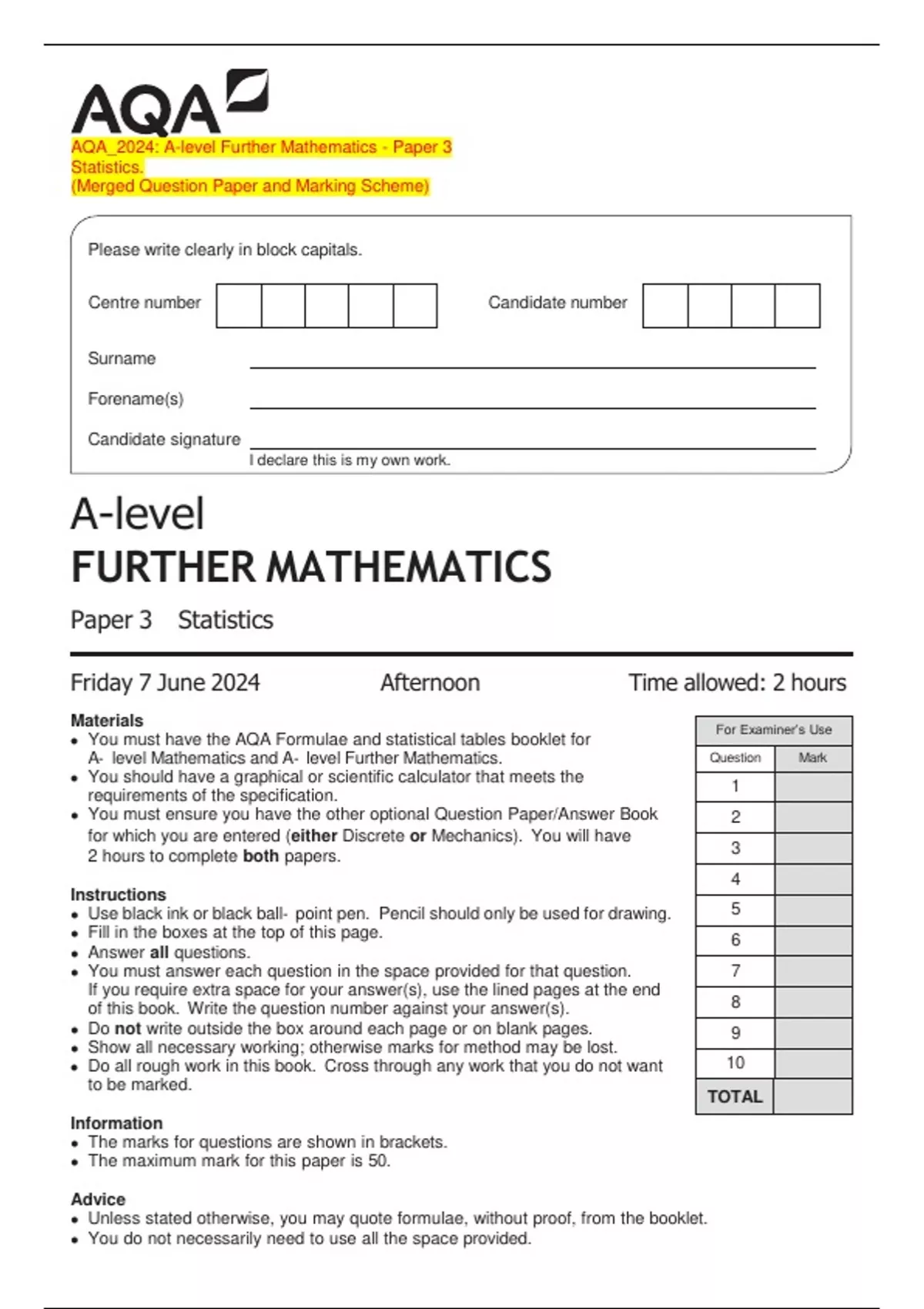  The maximum mark for this paper is 50.