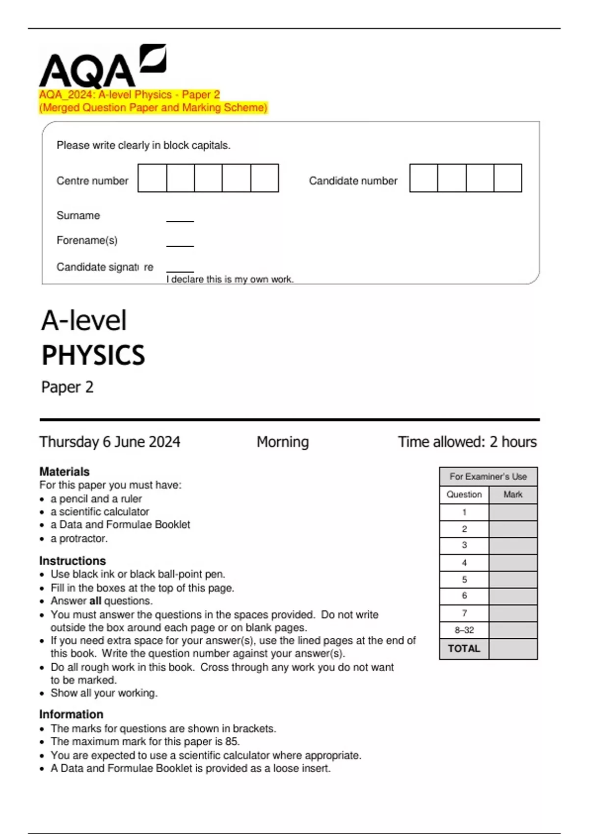 The maximum mark for this paper is 85.