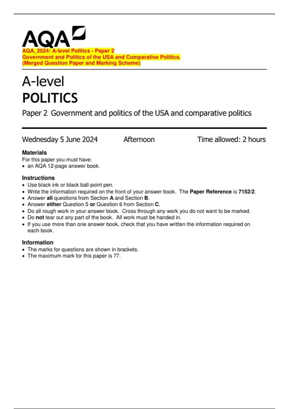 The maximum mark for this paper is 77.