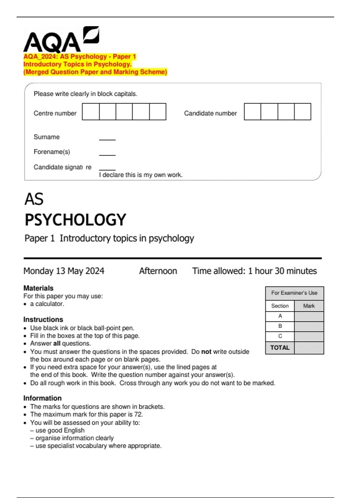 The maximum mark for this paper is 72.