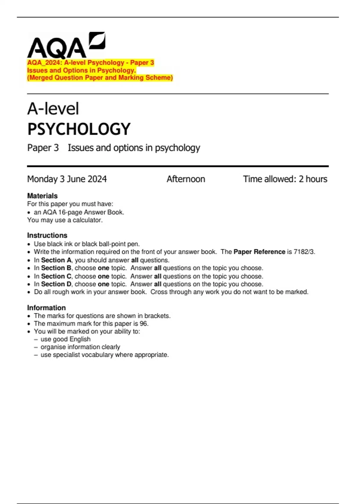 The maximum mark for this paper is 96.