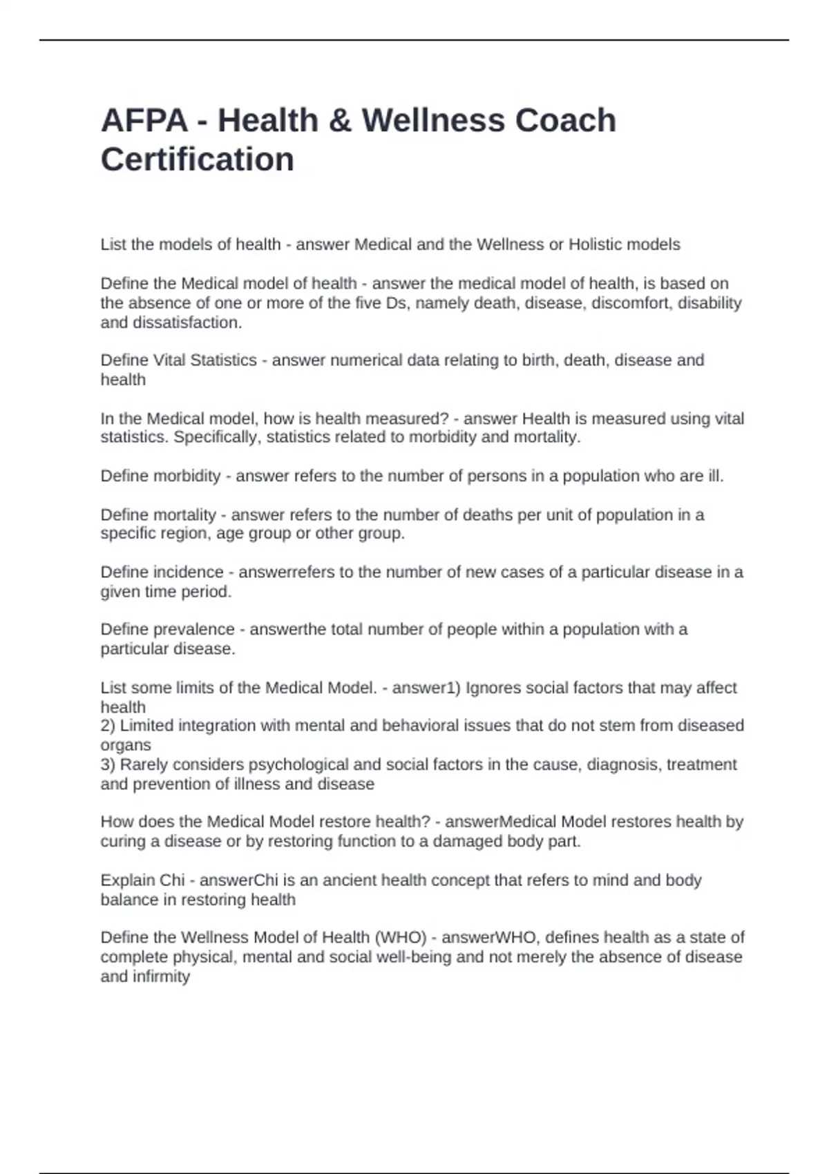 AFPA - Health & Wellness Coach Certification Questions and Answers Fully Solved