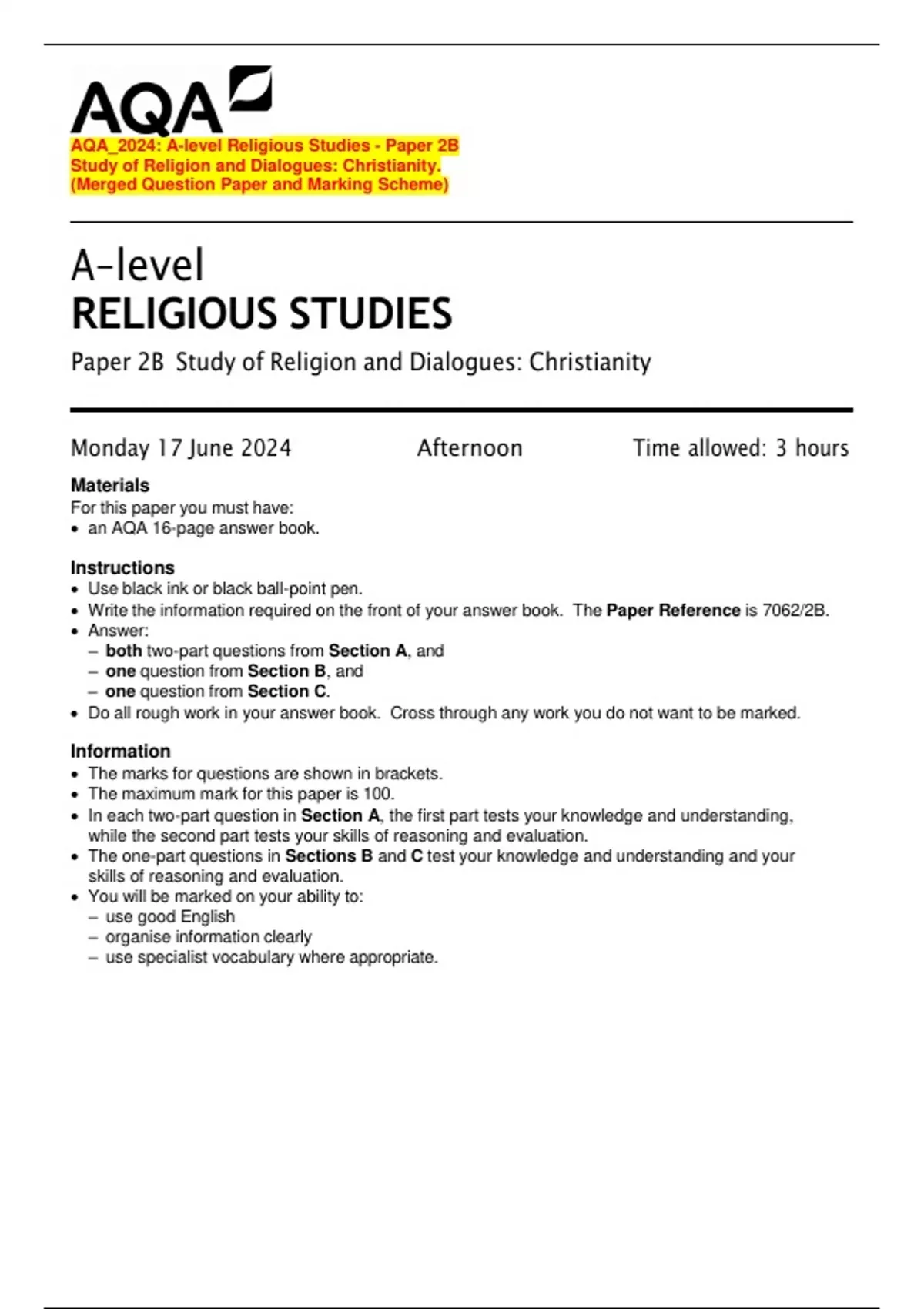AQA_2024: A-level Religious Studies - Paper 2B Study of Religion and Dialogues: Christianity. (Merged Question Paper and Marking Scheme)