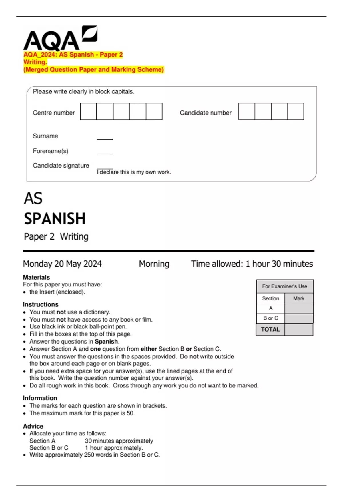 AQA_2024: AS Spanish - Paper 2 Writing. (Merged Question Paper and Marking Scheme)