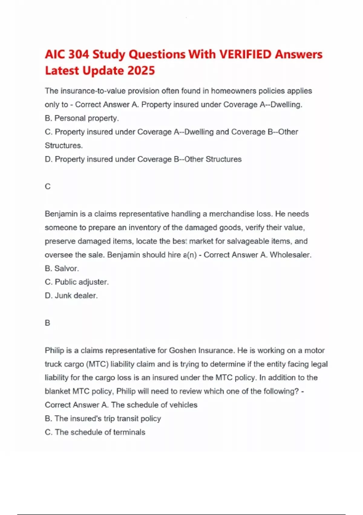 AIC 304 Study Questions With VERIFIED Answers Latest Update 2025 The insurance-to-value provision often found in homeowners policies applies only to - Correct Answer A. Property insured under Coverage A--Dwelling. B. Personal property. C. Property insured under Coverage A--Dwelling and Coverage B--Other Structures. D. Property insured under Coverage B--Other Structures C Benjamin is a claims representative handling a merchandise loss. He needs someone to prepare an inventory of the damaged goods, verify their value, preserve damaged items, locate the best market for salvageable items, and oversee the sale. Benjamin should hire a(n) - Correct Answer A. Wholesaler. B. Salvor. C. Public adjuster. D. Junk dealer. B Philip is a claims representative for Goshen Insurance. He is working on a motor truck cargo (MTC) liability claim and is trying to determine if the entity facing legal liability for the cargo loss is an insured under the MTC policy. In addition to the blanket MTC policy, Philip will need to review which one of the following? - Correct Answer A. The schedule of vehicles B. The insured's trip transit policy C. The schedule of terminals D. The carrier section of the bill of lading D Brenda and Tyrone are homeowners with a monthly mortgage of $1,200. Their home sustains damage from a fire, and restoration is expected to take several months to complete. They rent an apartment with a monthly rent of $1,500 to
