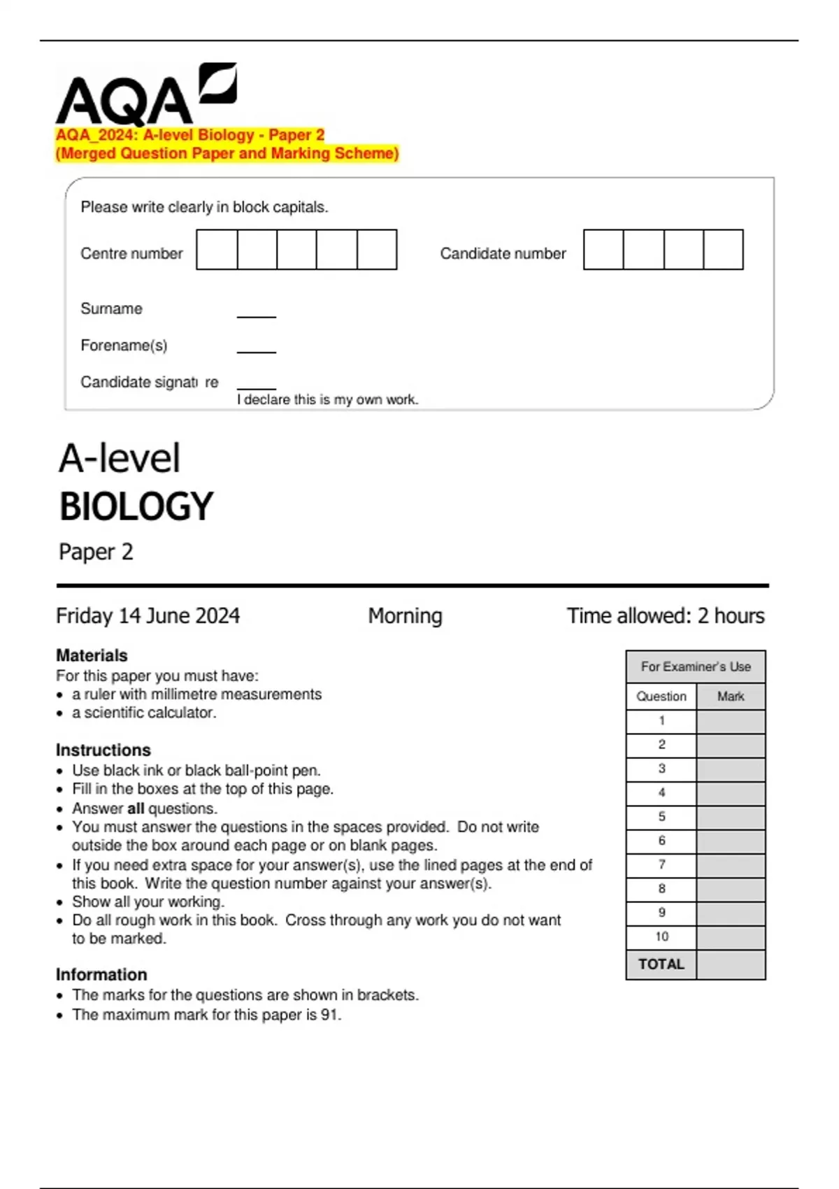 The maximum mark for this paper is 91.