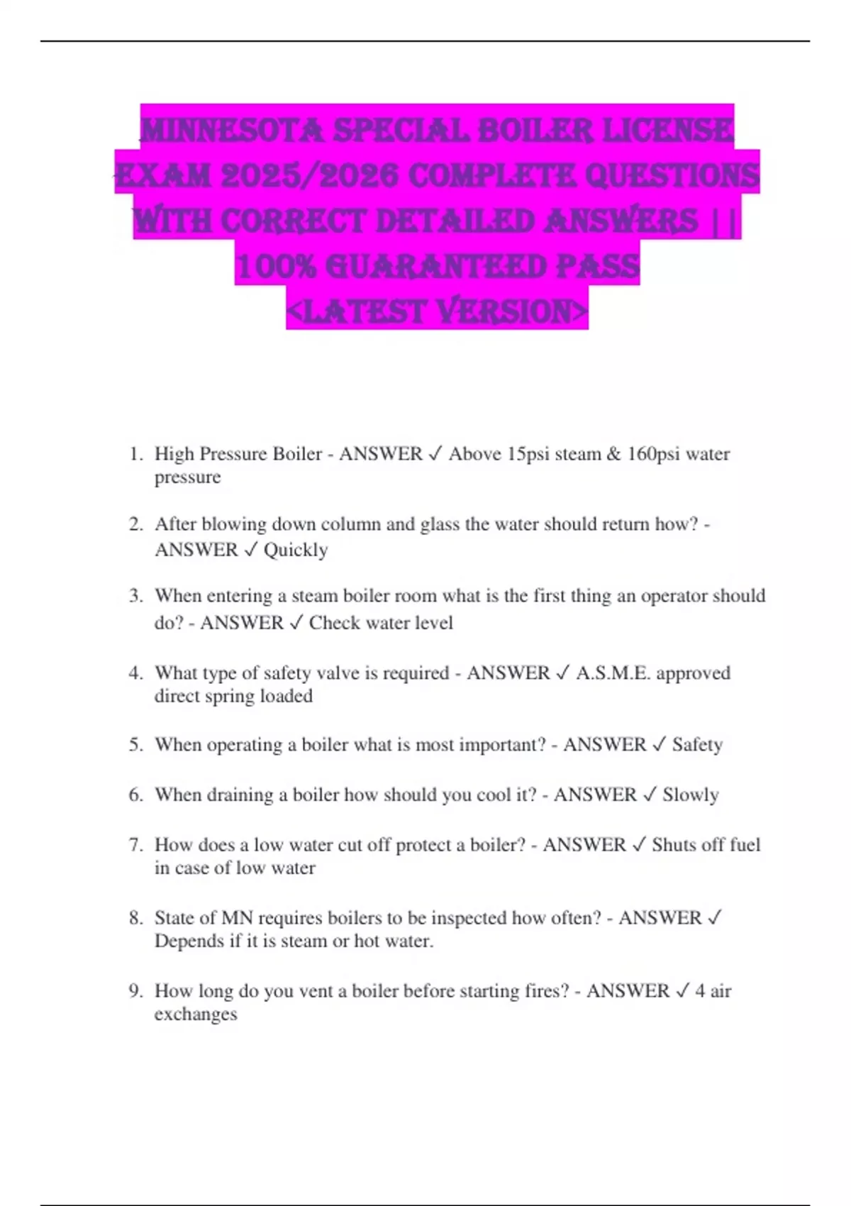 Minnesota Special Boiler License EXAM 2025/2026 COMPLETE QUESTIONS WITH CORRECT DETAILED ANSWERS || 100% GUARANTEED PASS &lt;LATEST VERSION&gt; 1. High Pressure Boiler - ANSWER Above 15psi steam & 160psi water pressure 2. After blowing down column and glass the water should return how? - ANSWER Quickly 3. When entering a steam boiler room what is the first thing an operator should do? - ANSWER Check water level 4. What type of safety valve is required - ANSWER A.S.M.E. approved direct spring loaded 5. When operating a boiler what is most important? - ANSWER Safety 6. When draining a boiler how should you cool it? - ANSWER Slowly 7. How does a low water cut off protect a boiler? - ANSWER Shuts off fuel in case of low water 8. State of MN requires boilers to be inspected how often? - ANSWER Depends if it is steam or hot water. 9. How long do you vent a boiler before starting fires? - ANSWER 4 air exchanges 10. What is the rapid burning of fuel and oxygen resulting in heat? - ANSWER Combustion 11. What is the purpose of bottom blowdowns besides removing sludge? - ANSWER To drain the boiler 12. What turns a hot water boiler on based on water temperature? - ANSWER An aquastat 13. Steam boilers under 200 horsepower must have low water cutoff tested how often? - ANSWER When in operation and on low fire 14. What is an indication of a gauge glass not working properly? - ANSWER No movement in the water glass 15. When comparing a hot water boiler to a steam boiler, what does a hot water boiler have that a steam boiler does not? - ANSWER Circulating pump, expansion tank, and an aquastat 16. What is the device that will shut the boiler down in case of low water? - ANSWER Low water cutoff 17. What must be displayed in a boiler room? - ANSWER Current license and log book 18. According to national board code, safety valves are to be tested how often? - ANSWER 90 days 19. What device removes air and condensate? - ANSWER Steam trap 20. What must be done after a hot water boiler has been drained, cleaned and refilled? - ANSWER Remove air 21. What can a special engineer operate? - ANSWER In charge of 50 horsepower. Shift operator 100 horsepower high or low pressure 22. What are the three main types of boilers? - ANSWER Fire tube, water tube, cast iron sectional 23. How much experience is required for a special license? - ANSWER No experience 24. At a minimum, what is required in a log book? - ANSWER Who, what and when 25. When in operation a 40 horsepower boiler may be left unattended for how long? - ANSWER 24 hours 26. What method of testing low water cut off most accurately simulates low water? - ANSWER Shutting off the feed pump and feeder valve supply and blowing down low water cutoff 27. How do we know if we are using and approved safety valve for a steam boiler or a safety relief valve for a hot water boiler? - ANSWER A spring loaded direct acting safety valve or safety relief valve. 28. Before testing a low water fuel cut-out what must be done? - ANSWER The burner must be on. 29. Heat can be transferred in how many ways? - ANSWER Three. 30. Aqua stats work by sensing: - ANSWER Temperature. 31. Name the different ways heat can be transferred and give a definition of each way. - ANSWER Radiation, Conduction, Convection 32. How many types of boilers are there? - ANSWER Three: Fire tube, Water tube, Cast iron sectional 33. What type of boiler can be made larger? - ANSWER Cast Iron sectional 34. What type of boiler has the water surrounding the tubes? - ANSWER Fire tube