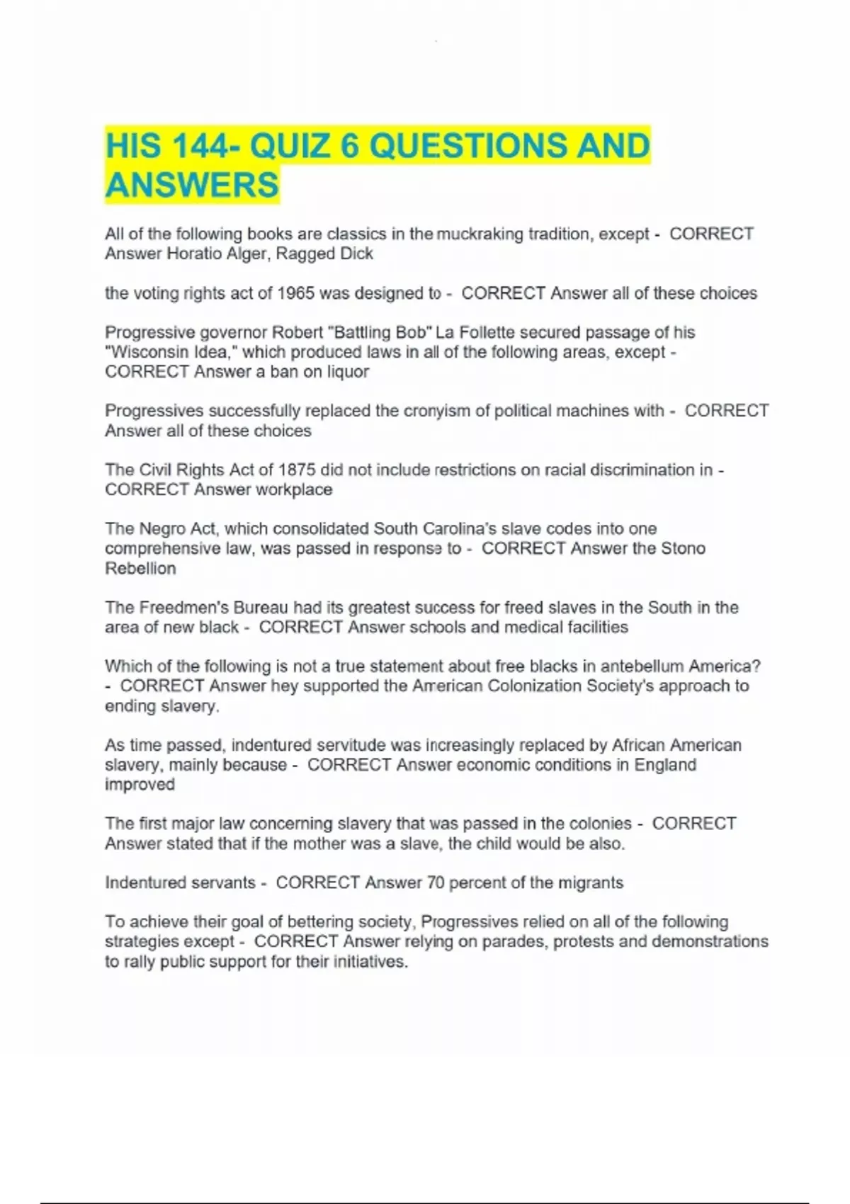 HIS 144- QUIZ 6 QUESTIONS AND ANSWERS All of the following books are classics in the muckraking tradition, except - CORRECT Answer Horatio Alger, Ragged Dick the voting rights act of 1965 was designed to - CORRECT Answer all of these choices Progressive governor Robert "Battling Bob" La Follette secured passage of his "Wisconsin Idea," which produced laws in all of the following areas, except - CORRECT Answer a ban on liquor Progressives successfully replaced the cronyism of political machines with - CORRECT Answer all of these choices The Civil Rights Act of 1875 did not include restrictions on racial discrimination in - CORRECT Answer workplace The Negro Act, which consolidated South Carolina's slave codes into one comprehensive law, was passed in response to - CORRECT Answer the Stono Rebellion The Freedmen's Bureau had its greatest success for freed slaves in the South in the area of new black - CORRECT Answer schools and medical facilities Which of the following is not a true statement about free blacks in antebellum America? - CORRECT Answer hey supported the American Colonization Society's approach to ending slavery. As time passed, indentured servitude was increasingly replaced by African American slavery, mainly because - CORRECT Answer economic conditions in England improved The first major law concerning slavery that was passed in the colonies - CORRECT Answer stated that if the mother was a slave, the child would be also. Indentured servants - CORRECT Answer 70 percent of the migrants To achieve their goal of bettering society, Progressives relied on all of the following strategies except - CORRECT Answer relying on parades, protests and demonstrations to rally public support for their initiatives. The reform impulse that swept through America in the first half of the nineteenth century sought improvements in all of the following areas except - CORRECT Answer Working conditions The black power movement - CORRECT Answer - Promoted Black Pride and black control