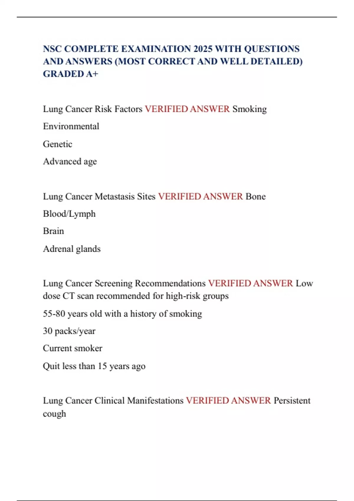 Lung Cancer Clinical Manifestations VERIFIED ANSWER Persistent