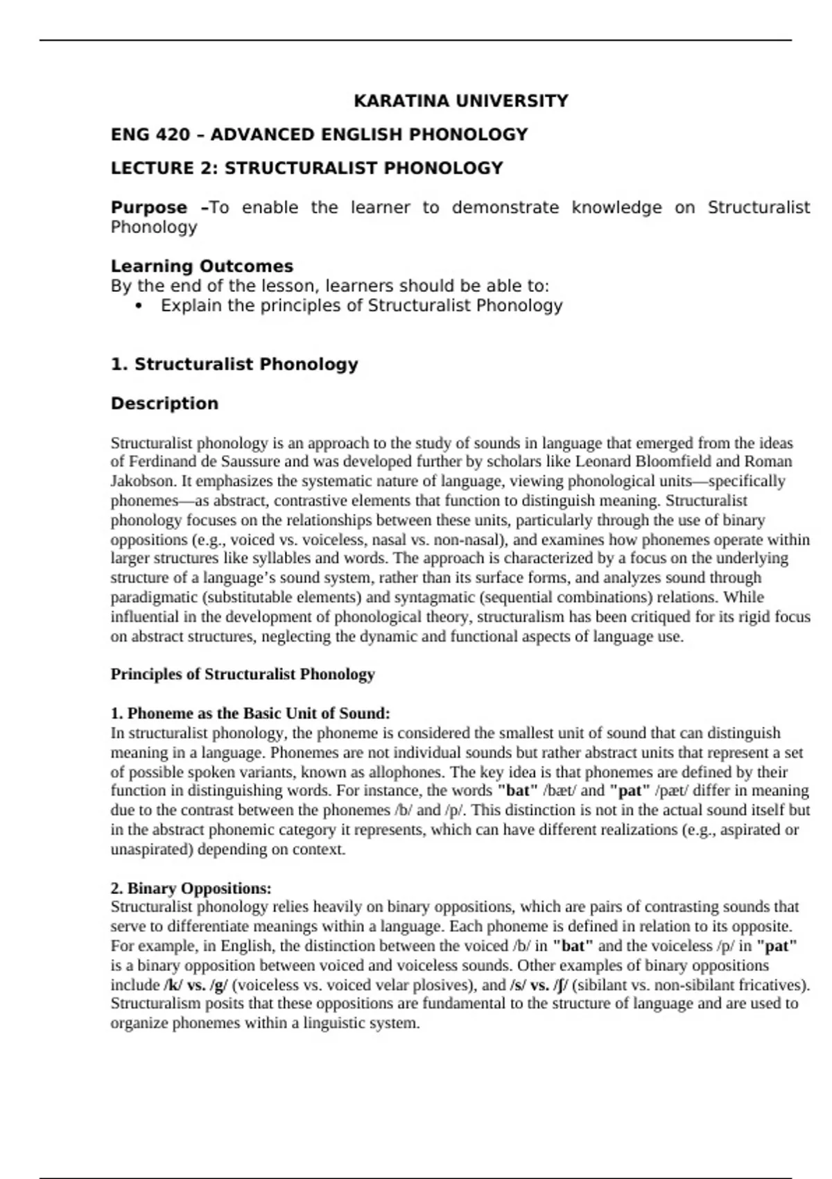 LECTURE 2: STRUCTURALIST PHONOLOGY