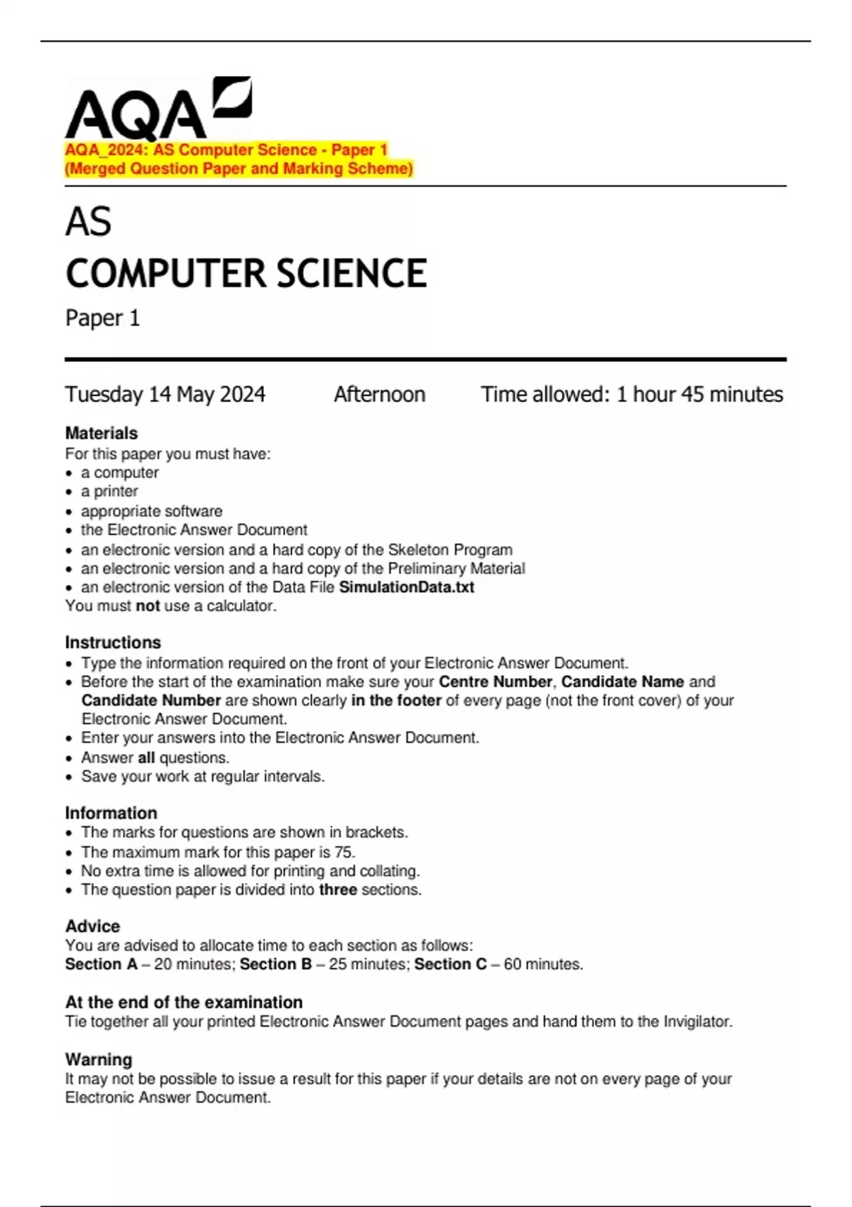The maximum mark for this paper is 75.
