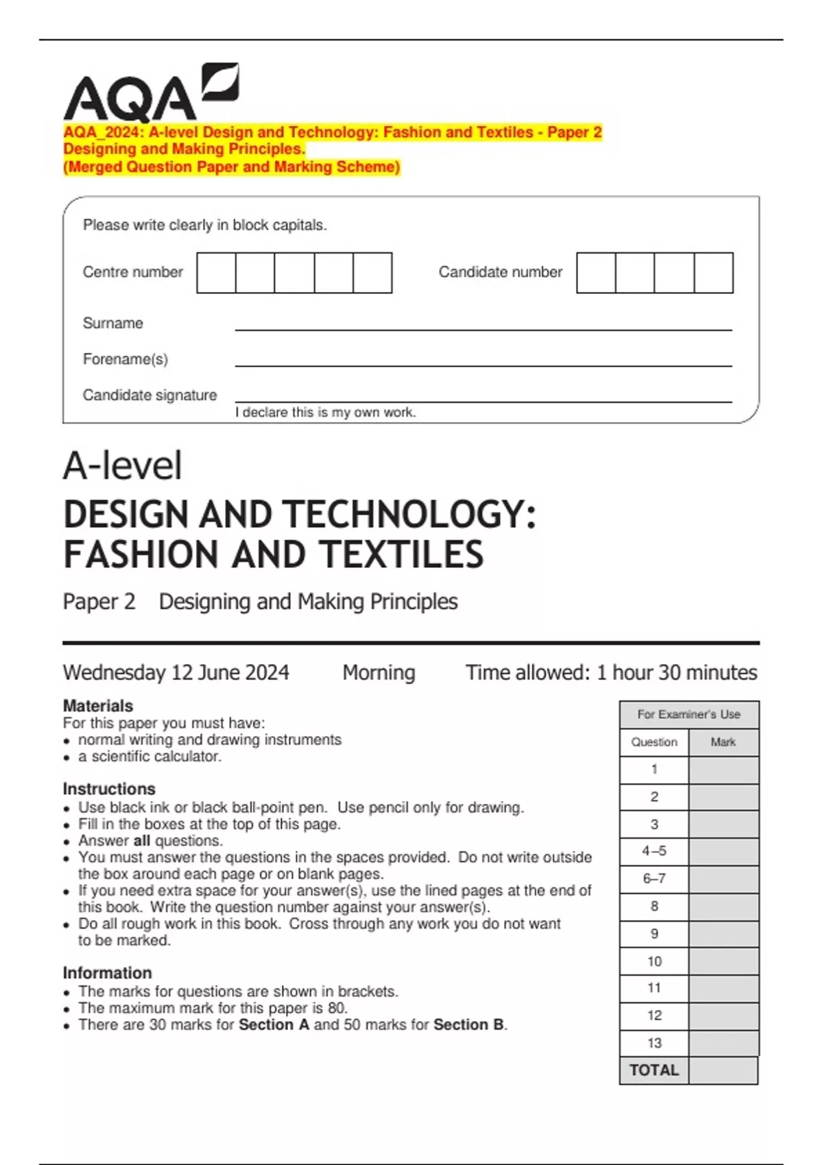 AQA_2024: A-level Design and Technology: Fashion and Textiles - Paper 2 Designing and Making Principles. (Merged Question Paper and Marking Scheme)