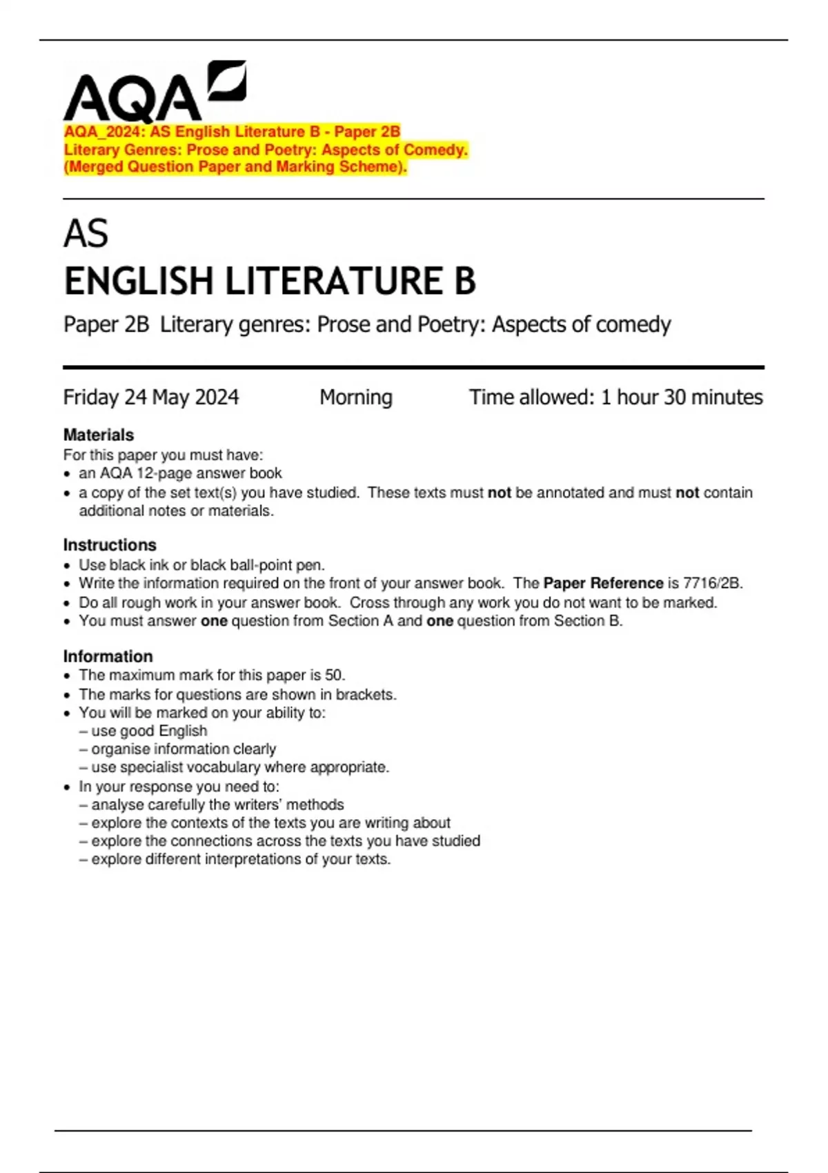 Paper 2B Literary genres: Prose and Poetry: Aspects of comedy