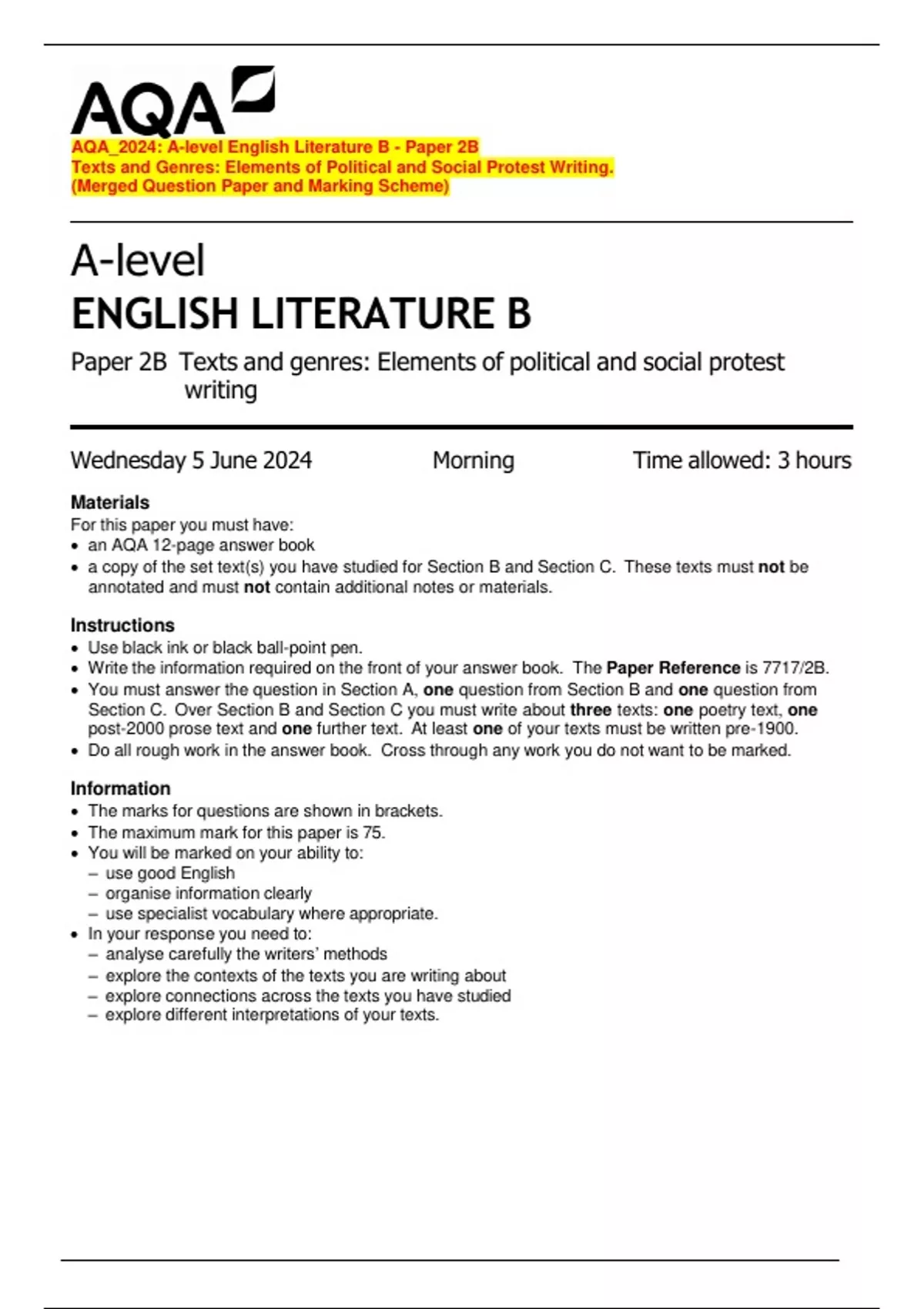 AQA_2024: A-level English Literature B - Paper 2B Texts and Genres: Elements of Political and Social Protest Writing. (Merged Question Paper and Marking Scheme)