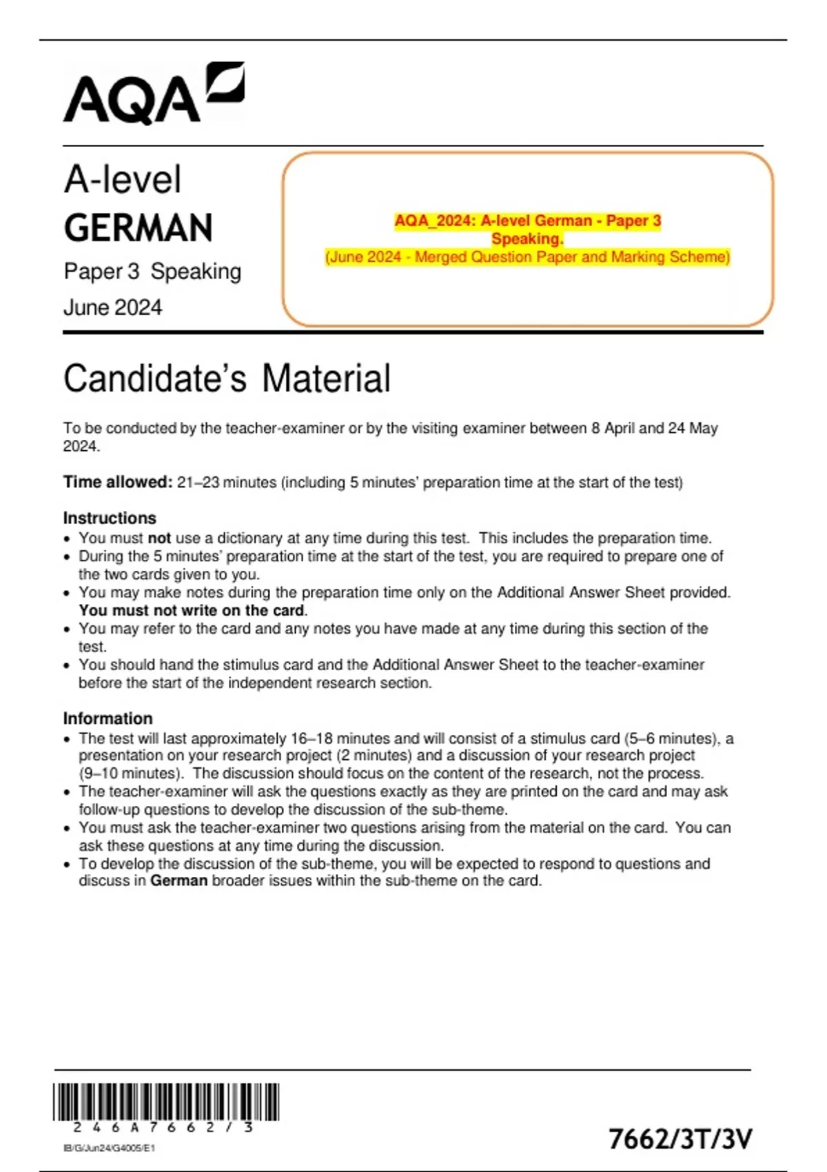 AQA_2024: A-level German - Paper 3 Speaking. (June 2024 - Merged Question Paper and Marking Scheme)