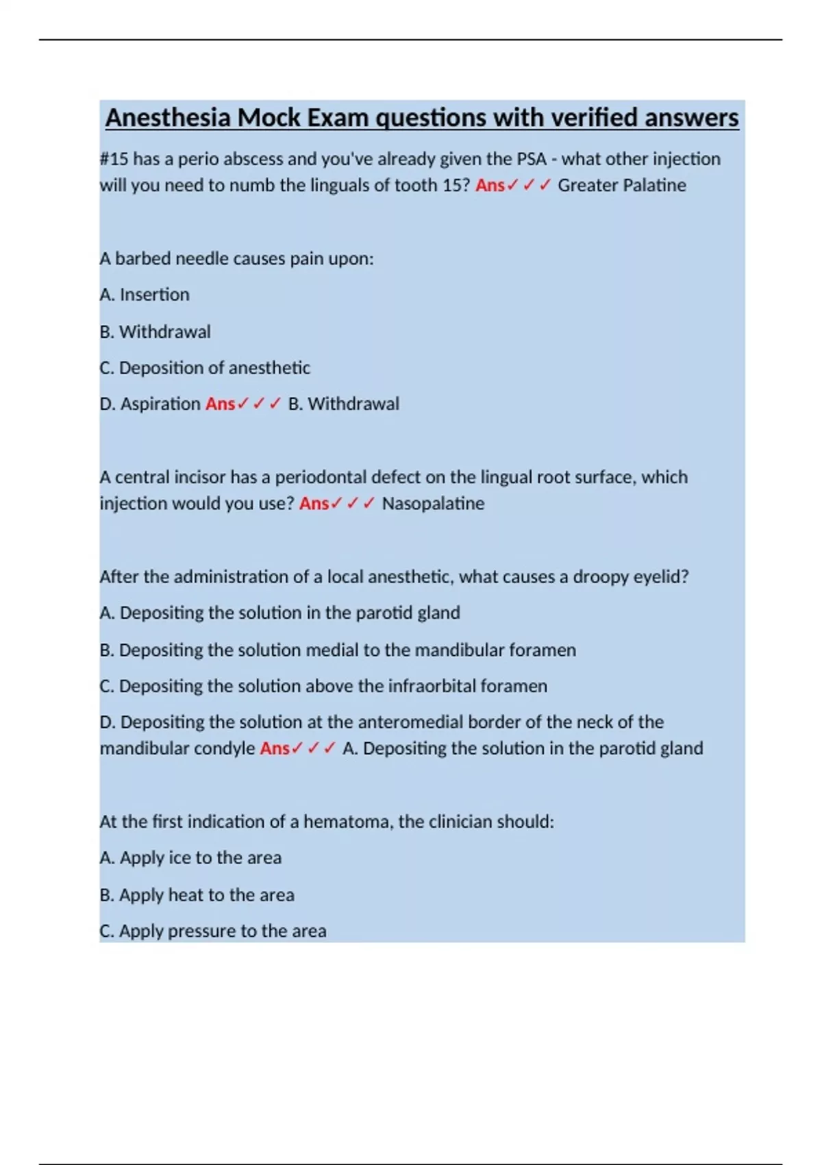 D. The needle touching the pterygomandibular raphe Ans✓✓✓ B. The needle