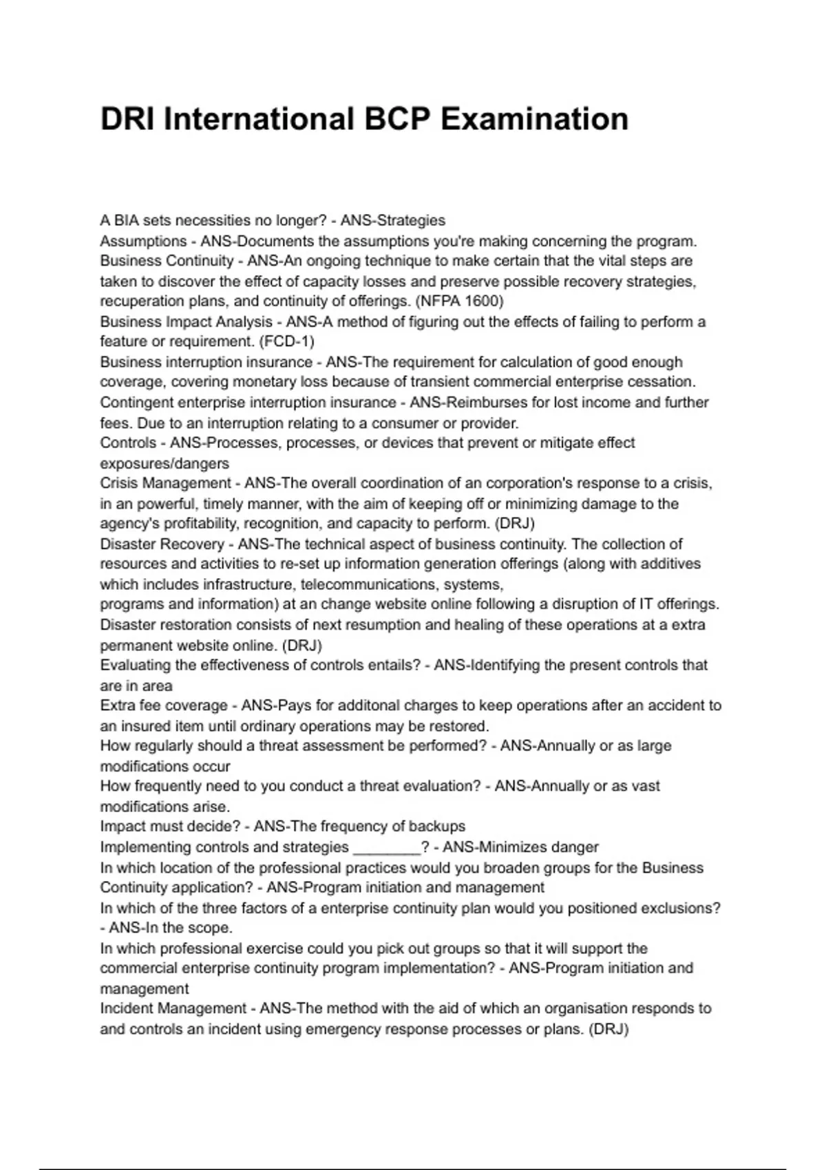 DRI International BCP Examination QUESTIONS WITH DETAILED VERIFIED ANSWERS (100% CORRECT ANSWERS) /ALREADY GRADED A+