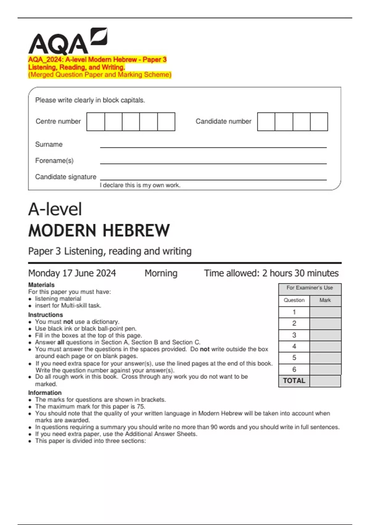 Monday 17 June 2024 Morning Time allowed: 2 hours 30 minutes