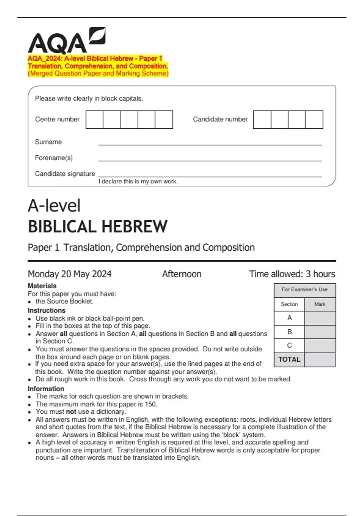AQA_2024: A-level Biblical Hebrew - Paper 1 Translation, Comprehension, and Composition. (Merged Question Paper and Marking Scheme)