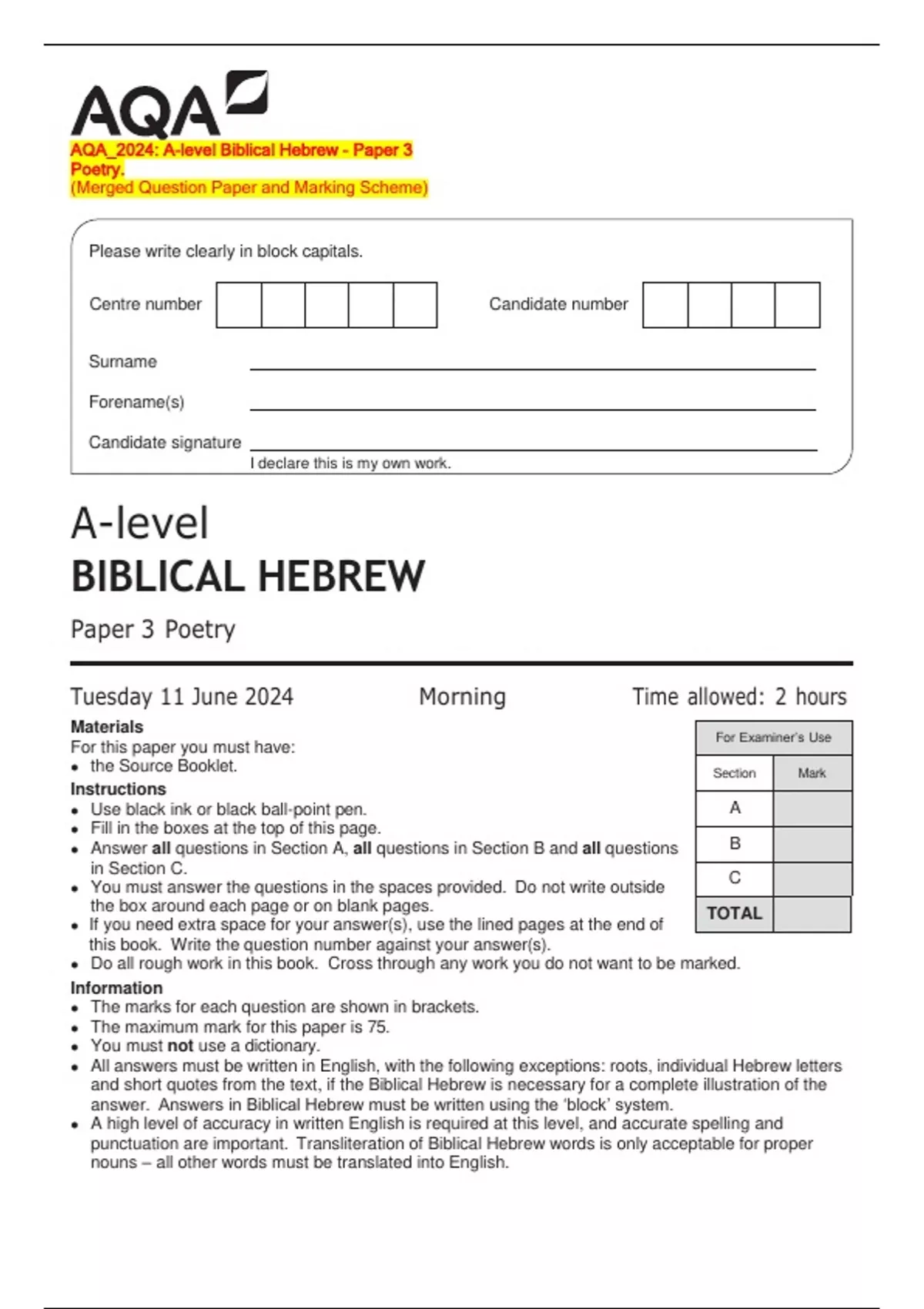 AQA_2024: A-level Biblical Hebrew - Paper 3 Poetry. (Merged Question Paper and Marking Scheme)