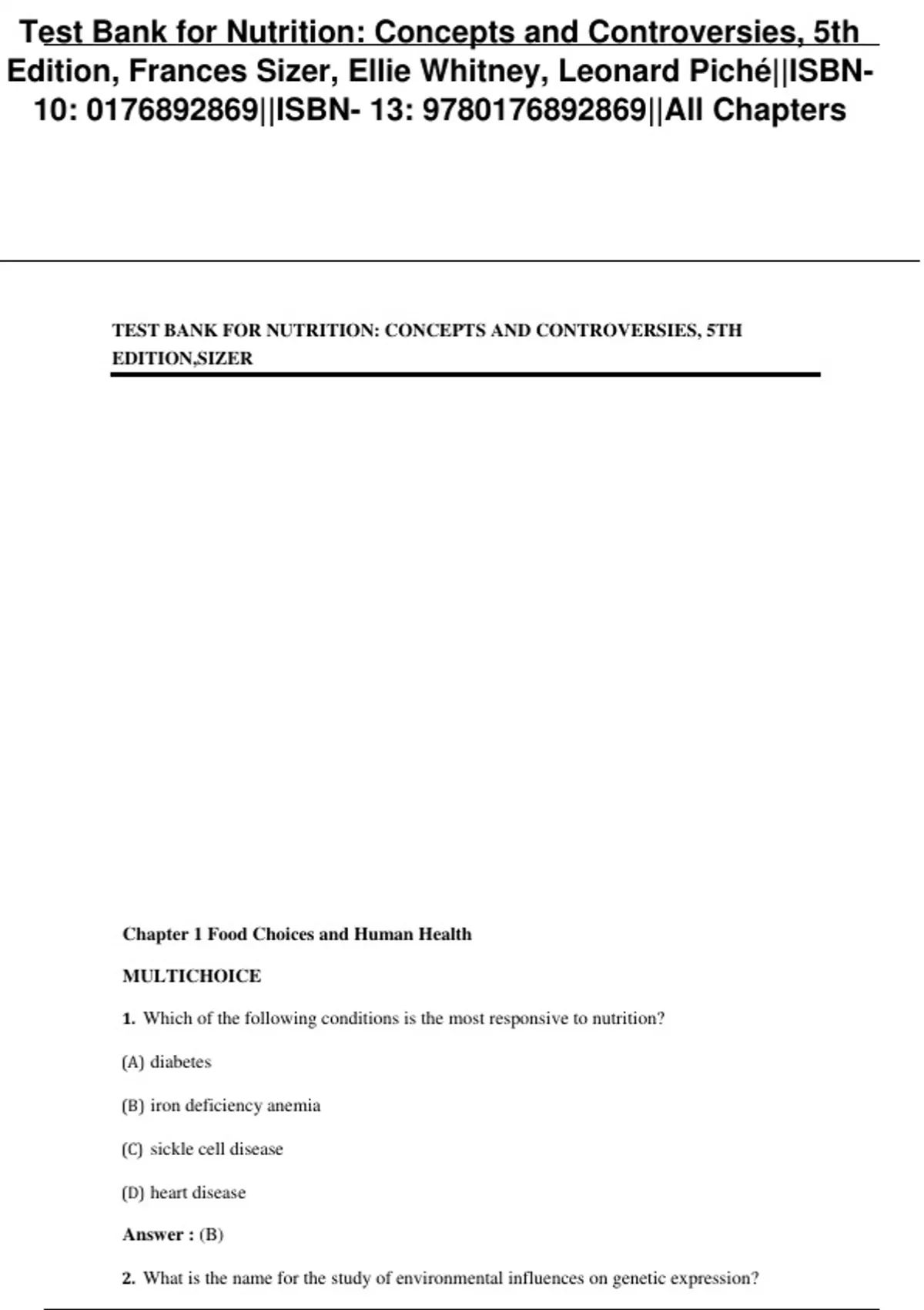 TEST BANK FOR NUTRITION: CONCEPTS AND CONTROVERSIES, 5TH