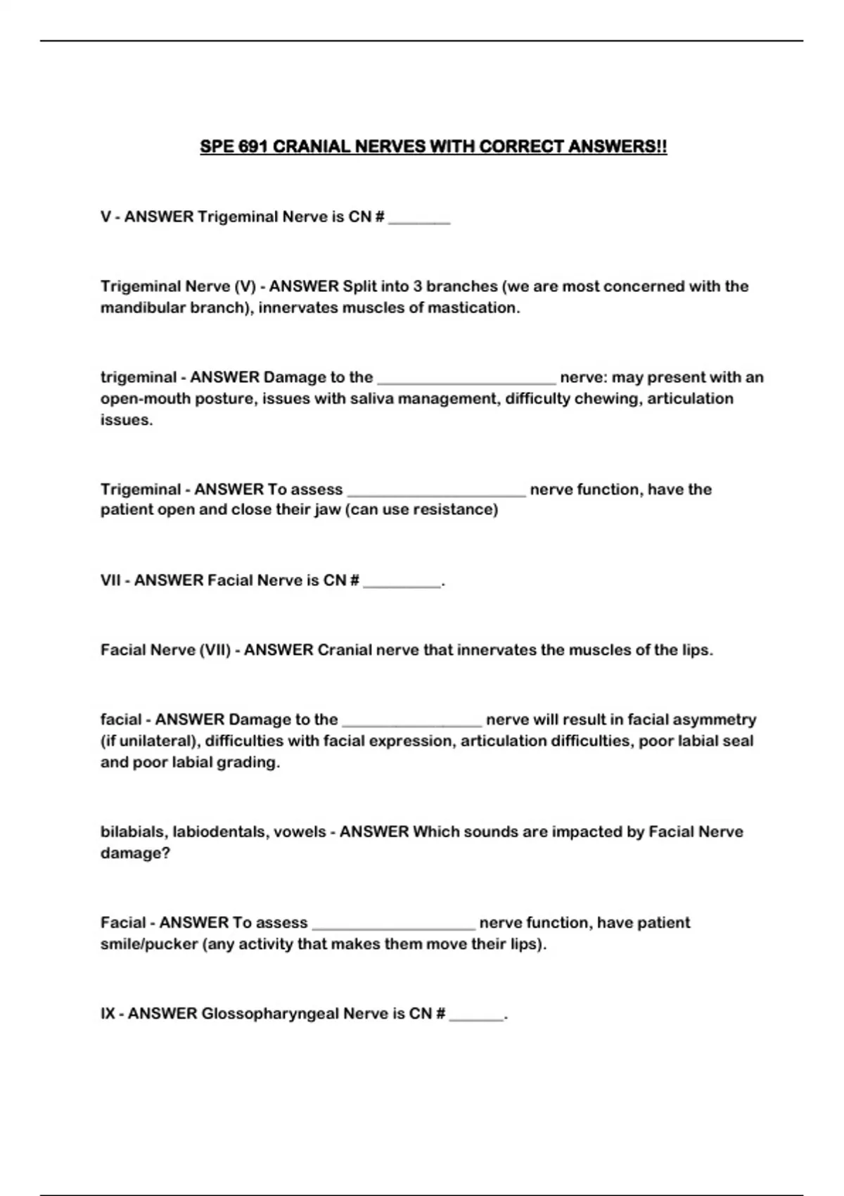 SPE 691 CRANIAL NERVES WITH CORRECT ANSWERS!!...