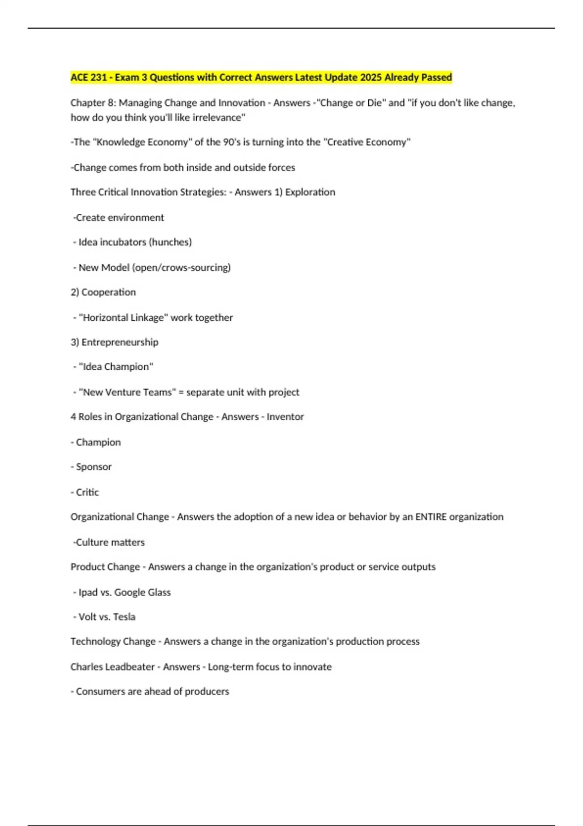 ACE 231 - Exam 3 Questions with Correct Answers Latest Update 2025 Already Passed Chapter 8: Managing Change and Innovation - Answers -"Change or Die" and "if you don't like change, how do you think you'll like irrelevance" -The "Knowledge Economy" of the 90's is turning into the "Creative Economy" -Change comes from both inside and outside forces Three Critical Innovation Strategies: - Answers 1) Exploration -Create environment - Idea incubators (hunches) - New Model (open/crows-sourcing) 2) Cooperation - "Horizontal Linkage" work together 3) Entrepreneurship - "Idea Champion" - "New Venture Teams" = separate unit with project 4 Roles in Organizational Change - Answers - Inventor - Champion - Sponsor - Critic Organizational Change - Answers the adoption of a new idea or behavior by an ENTIRE organization -Culture matters Product Change - Answers a change in the organization's product or service outputs - Ipad vs. Google Glass - Volt vs. Tesla Technology Change - Answers a change in the organization's production process Charles Leadbeater - Answers - Long-term focus to innovate - Consumers are ahead of producers - Big ideas DO NOT come from big organizations in mainstream markets People Change - Answers individuals, training, and over-communication are KEY Culture Change - Answers involves the entire organization, how do you change beliefs, behaviors, and attitudes? 4 Typical Responses to Change - Answers - Victim - Bystander - Critic - Navigator Organizational Development - Answers planned, systematic process of change using behavioral science Goals of Organizational Development - Answers - Improve the organization's effectiveness - Improve the internal relationships - Increase learning internally - Improve problem solving internally 3 types of Problems that Organizational Development Addresses - Answers - Mergers and acquisitions - Organizational decline and revitalization (Poor business results) - Conflict Management (between departments) Implementing Change - Answers Outline the need for change - Show performance gap Understand the resistance to change - Self-interest - Lack of understanding and trust - Uncertainty - Different assessments and goals Force-Field Analysis - Answers - Driving Forces: problems or opportunities that provide motivation for change - Restraining Forces: barriers to change Chapter 9: Managing Human Resources and Diversity - Answers - The strategic role of human resources management is to drive organizational performance - The right people become more competitive; improve quality, innovation, and customer service; retain during mergers and acquisitions, and apply new information technology for e-business Company Strategy: Strategic Human Resource Management - A