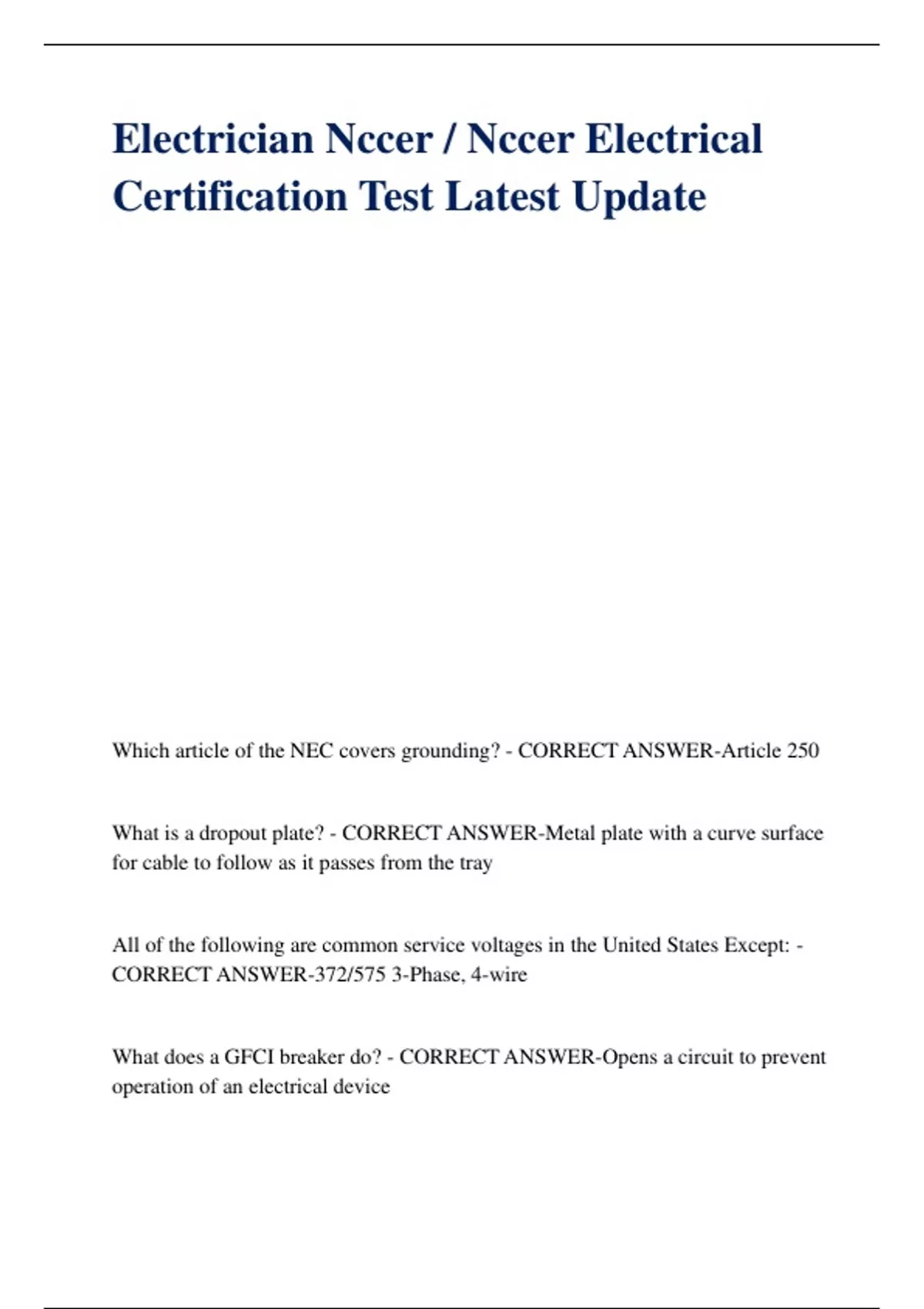 Electrician Nccer / Nccer Electrical Certification Test Latest Update Which article of the NEC covers grounding? - CORRECT ANSWER-Article 250 What is a dropout plate? - CORRECT ANSWER-Metal plate with a curve surface for cable to follow as it passes from the tray All of the following are common service voltages in the United States Except: - CORRECT ANSWER-372/575 3-Phase, 4-wire What does a GFCI breaker do? - CORRECT ANSWER-Opens a circuit to prevent operation of an electrical device