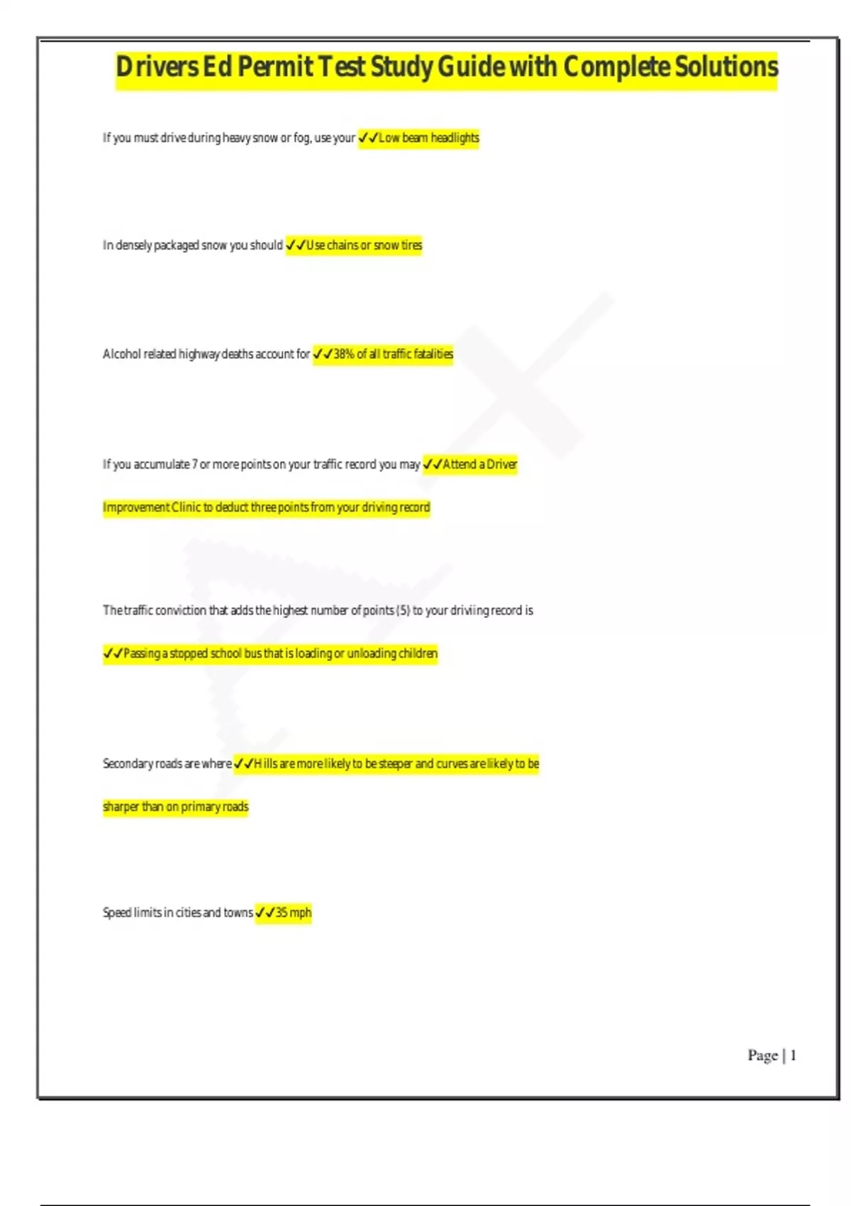 , Drivers Ed Permit Test Study Guide with Complete Solutions