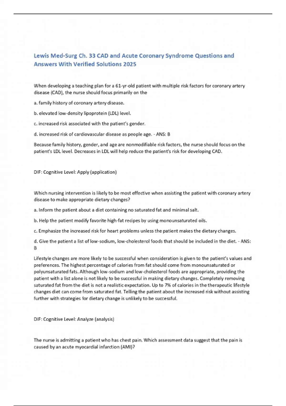 Lewis Med-Surg Ch. 33 CAD and Acute Coronary Syndrome Questions and Answers With Verified Solutions 2025