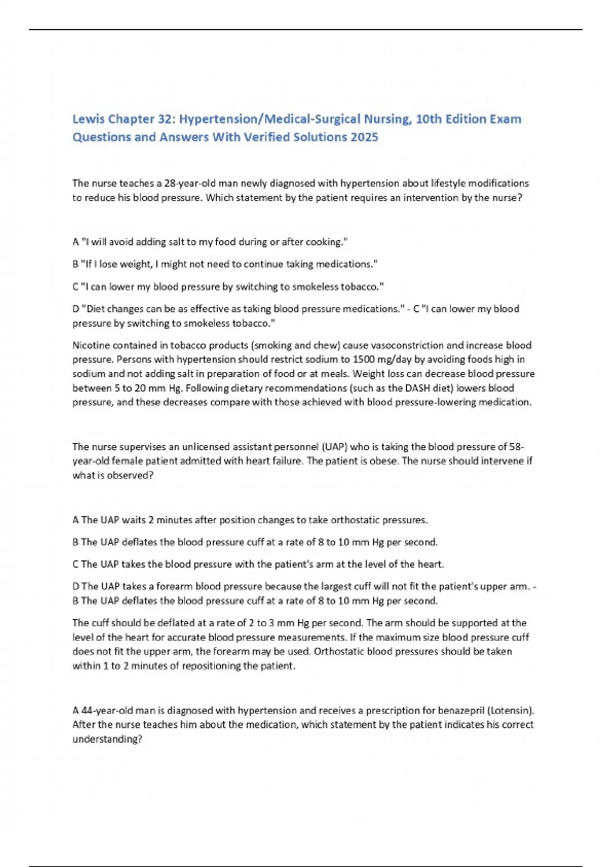 Lewis Chapter 32: Hypertension/Medical-Surgical Nursing, 10th Edition Exam Questions and Answers With Verified Solutions 2025