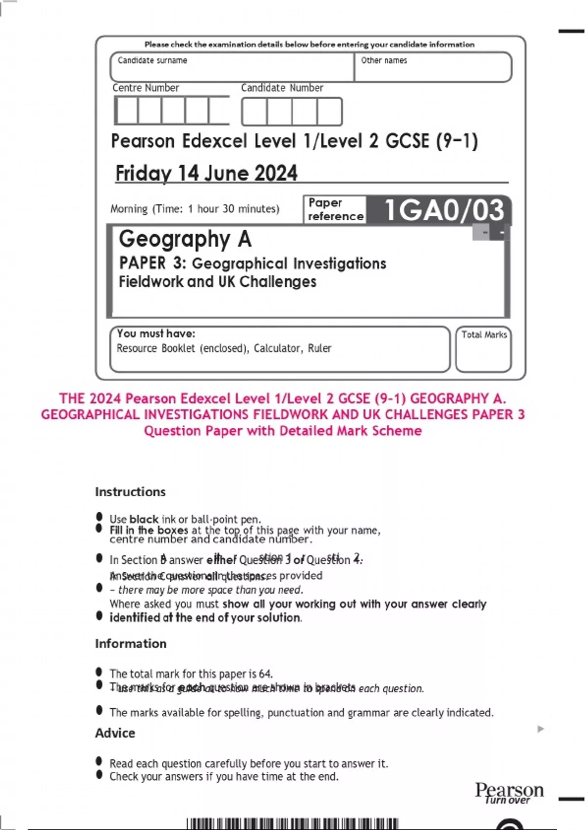 THE 2024 Pearson Edexcel Level 1/Level 2 GCSE (9–1) GEOGRAPHY A. GEOGRAPHICAL INVESTIGATIONS FIELDWORK AND UK CHALLENGES PAPER 3 Question Paper with Detailed Mark Scheme