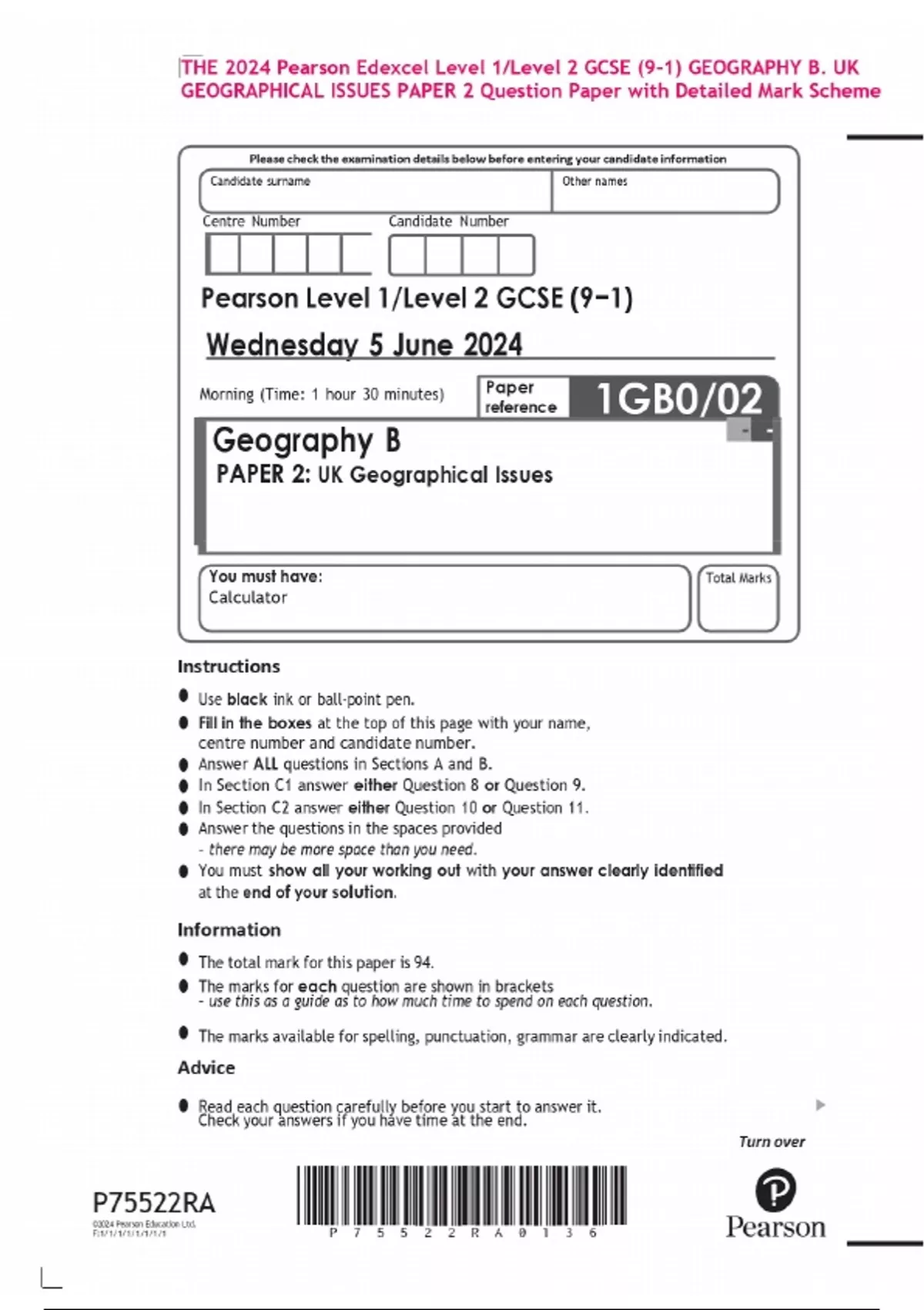 THE 2024 Pearson Edexcel Level 1/Level 2 GCSE (9–1) GEOGRAPHY B. UK GEOGRAPHICAL ISSUES PAPER 2 Question Paper with Detailed Mark Scheme