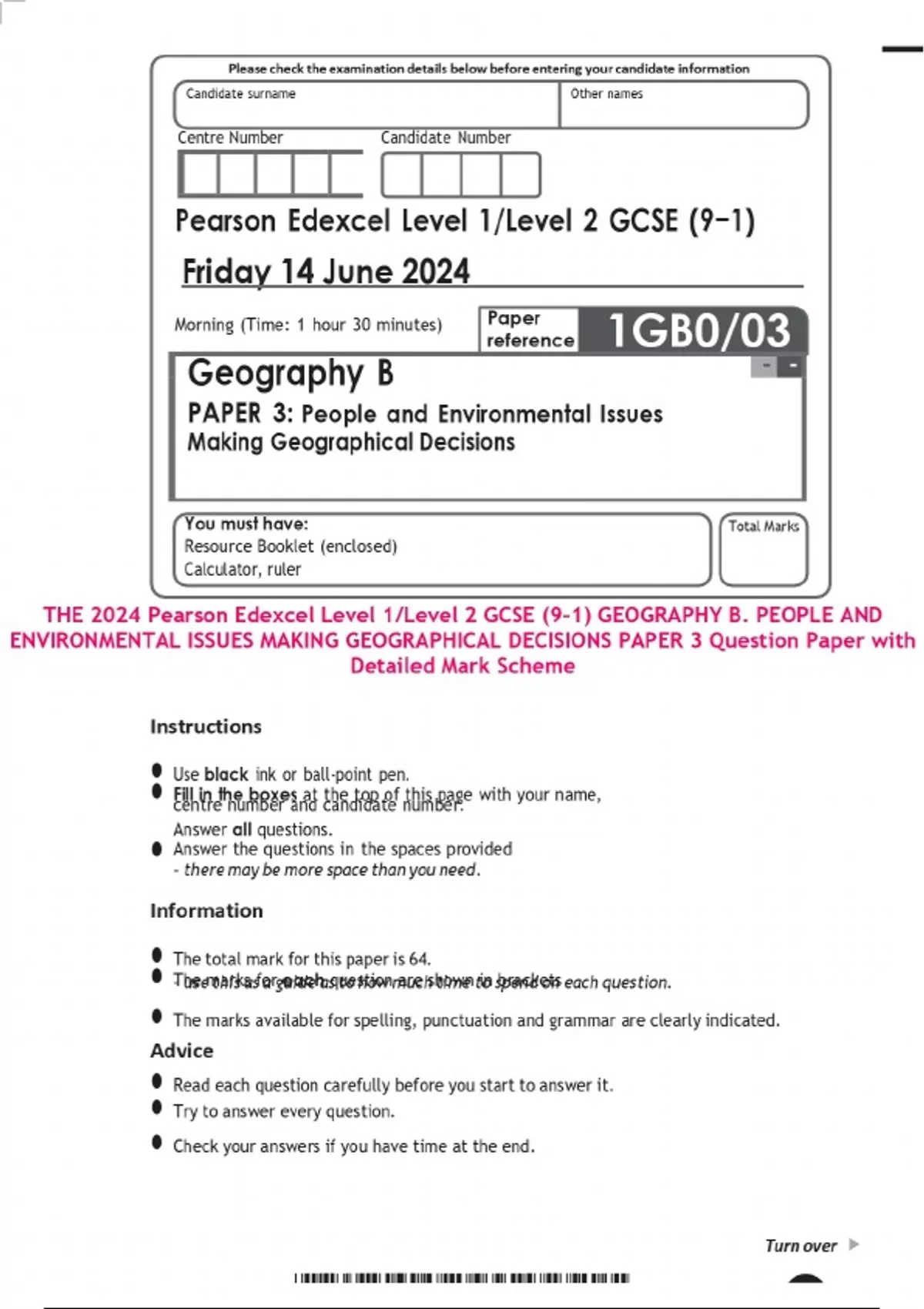 THE 2024 Pearson Edexcel Level 1/Level 2 GCSE (9–1) GEOGRAPHY B. PEOPLE AND ENVIRONMENTAL ISSUES MAKING GEOGRAPHICAL DECISIONS PAPER 3 Question Paper with Detailed Mark Scheme