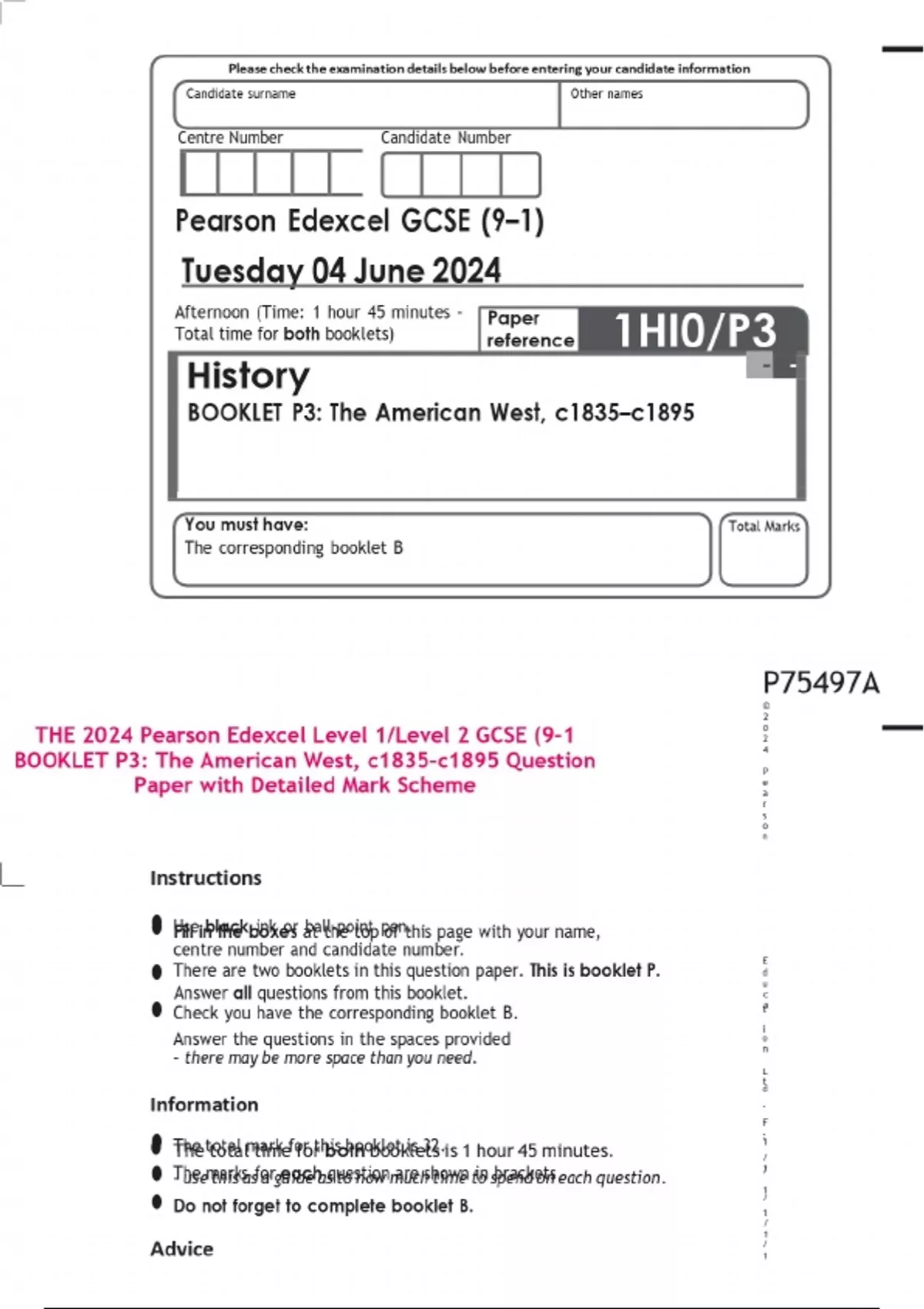 THE 2024 Pearson Edexcel Level 1/Level 2 GCSE (9–1 BOOKLET P3: The American West, c1835–c1895 Question Paper with Detailed Mark Scheme