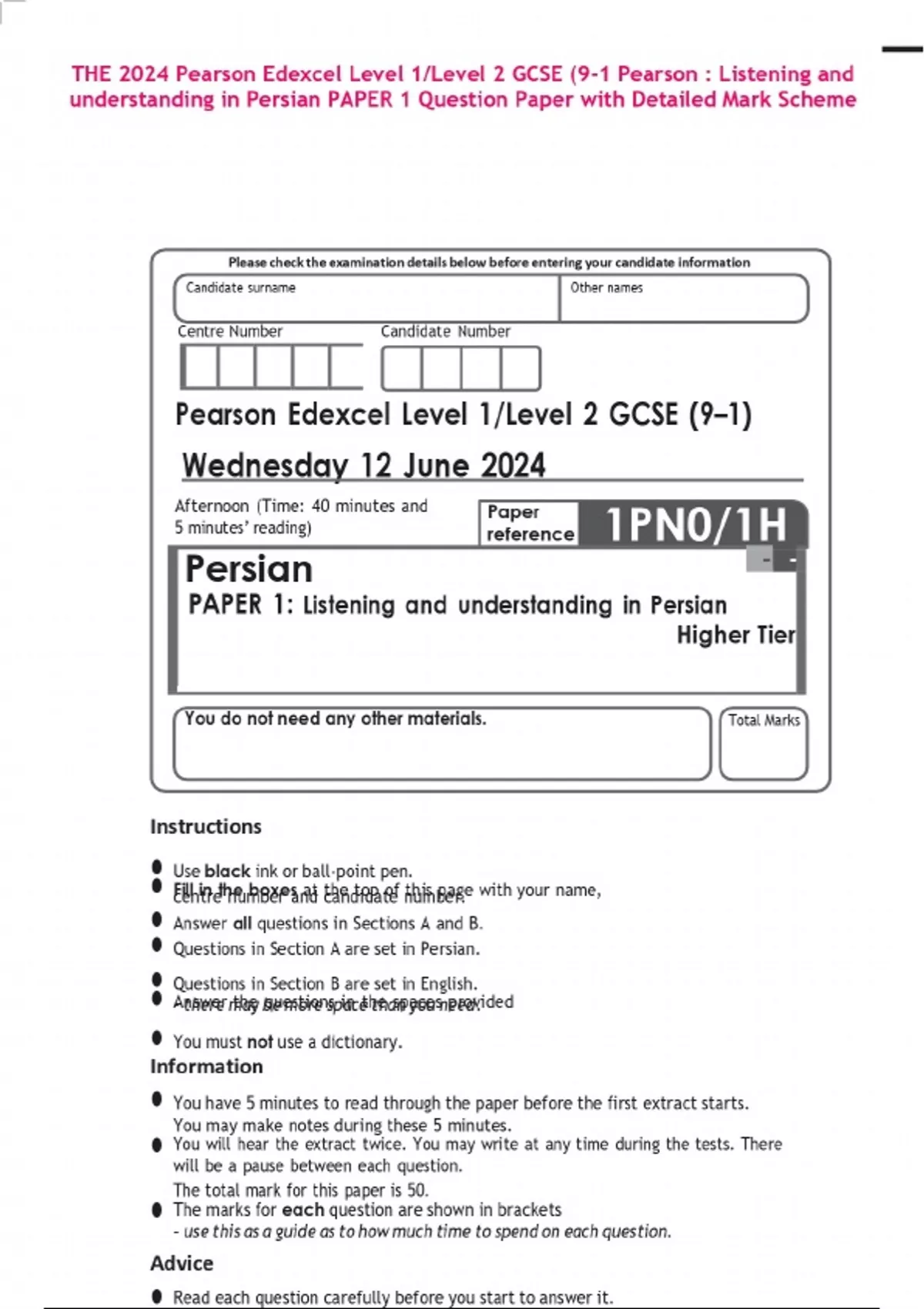 THE 2024 Pearson Edexcel Level 1/Level 2 GCSE (9-1 Pearson : Listening and understanding in Persian PAPER 1 Question Paper with Detailed Mark Scheme
