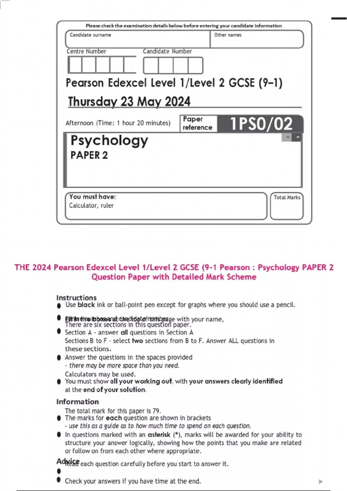 THE 2024 Pearson Edexcel Level 1/Level 2 GCSE (9-1 Pearson : Psychology PAPER 2 Question Paper with Detailed Mark Scheme
