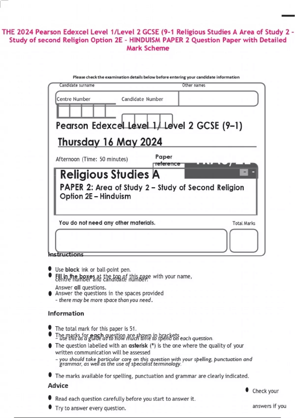 THE 2024 Pearson Edexcel Level 1/Level 2 GCSE (9-1 Religious Studies A Area of Study 2 – Study of second Religion Option 2E – HINDUISM PAPER 2 Question Paper with Detailed Mark Scheme