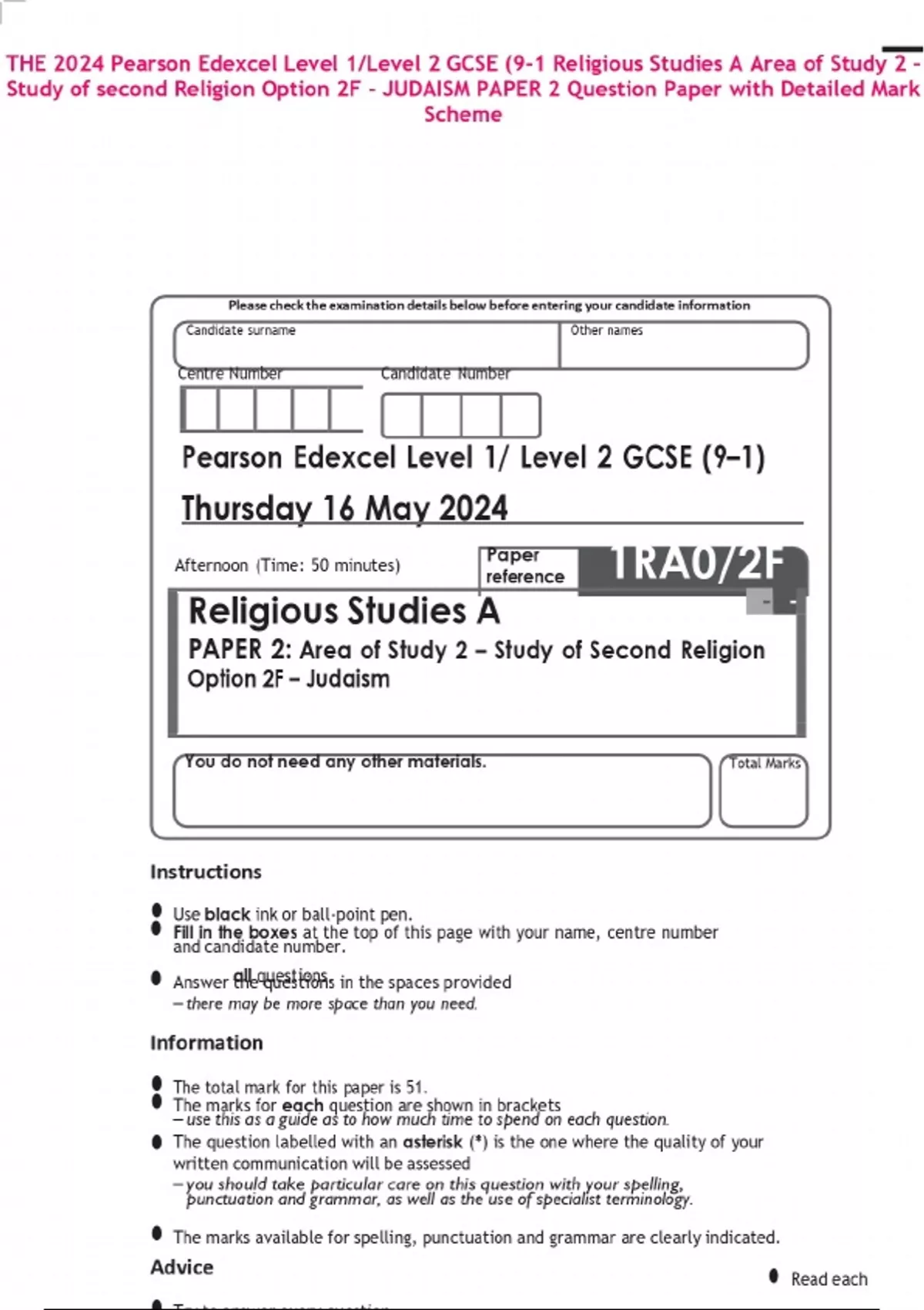 THE 2024 Pearson Edexcel Level 1/Level 2 GCSE (9-1 Religious Studies A Area of Study 2 – Study of second Religion Option 2F – JUDAISM PAPER 2 Question Paper with Detailed Mark Scheme