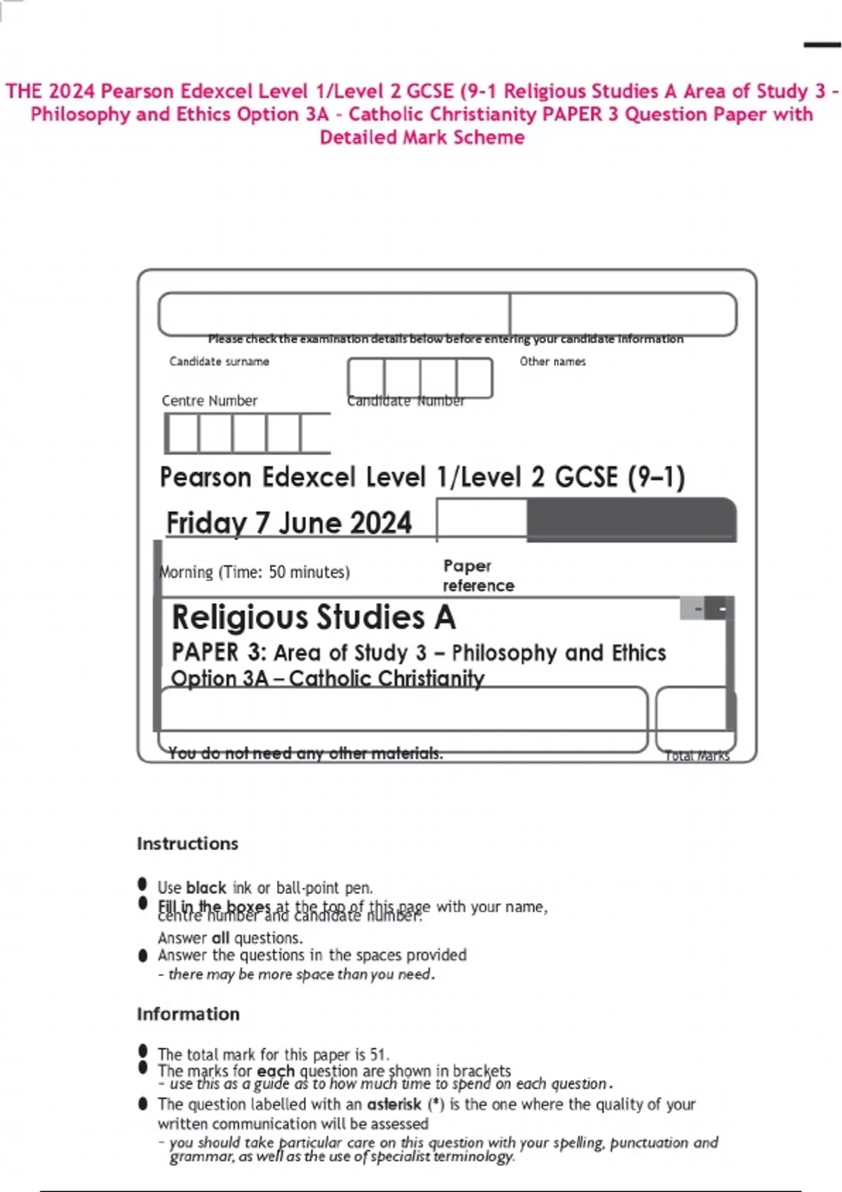 THE 2024 Pearson Edexcel Level 1/Level 2 GCSE (9-1 Religious Studies A Area of Study 3 – Philosophy and Ethics Option 3A – Catholic Christianity PAPER 3 Question Paper with Detailed Mark Scheme
