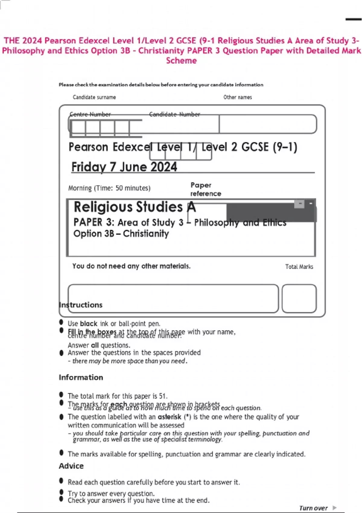THE 2024 Pearson Edexcel Level 1/Level 2 GCSE (9-1 Religious Studies A Area of Study 3– Philosophy and Ethics Option 3B – Christianity PAPER 3 Question Paper with Detailed Mark Scheme