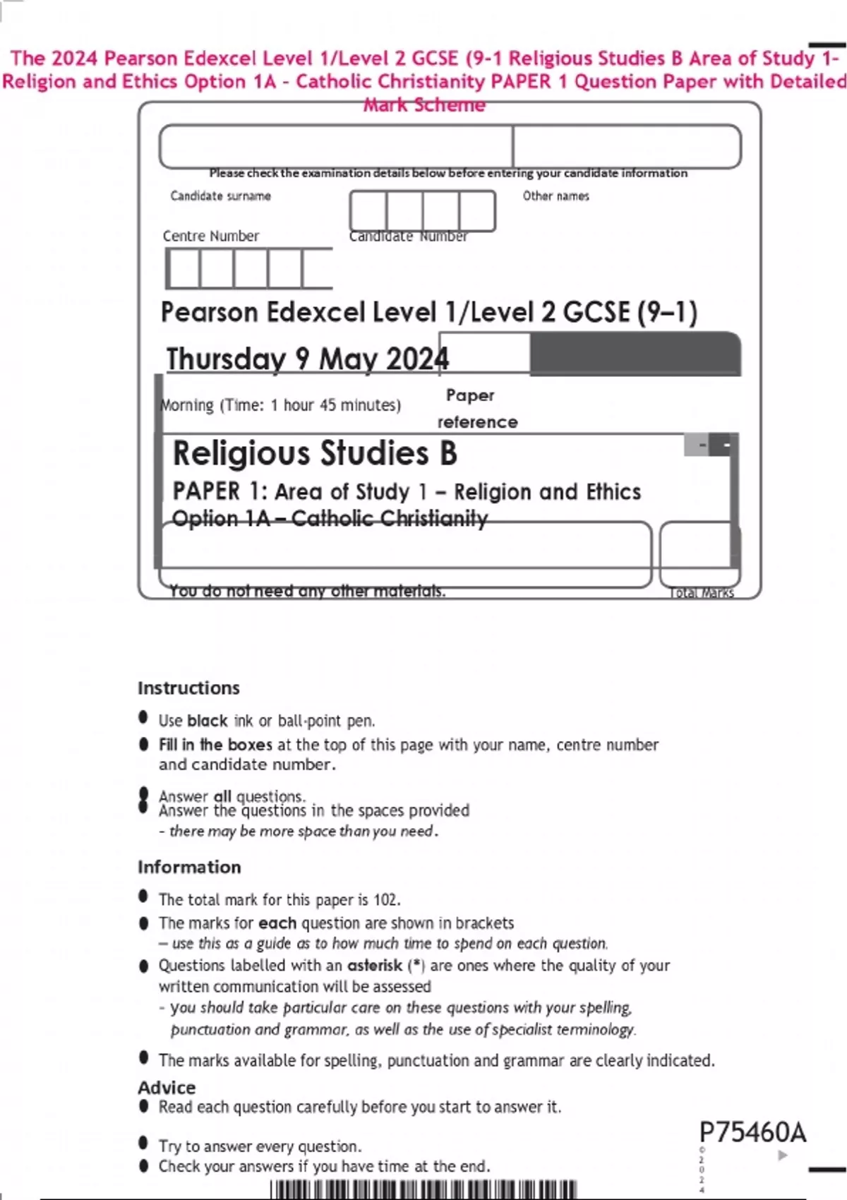 The 2024 Pearson Edexcel Level 1/Level 2 GCSE (9-1 Religious Studies B Area of Study 1– Religion and Ethics Option 1A – Catholic Christianity PAPER 1 Question Paper with Detailed Mark Scheme