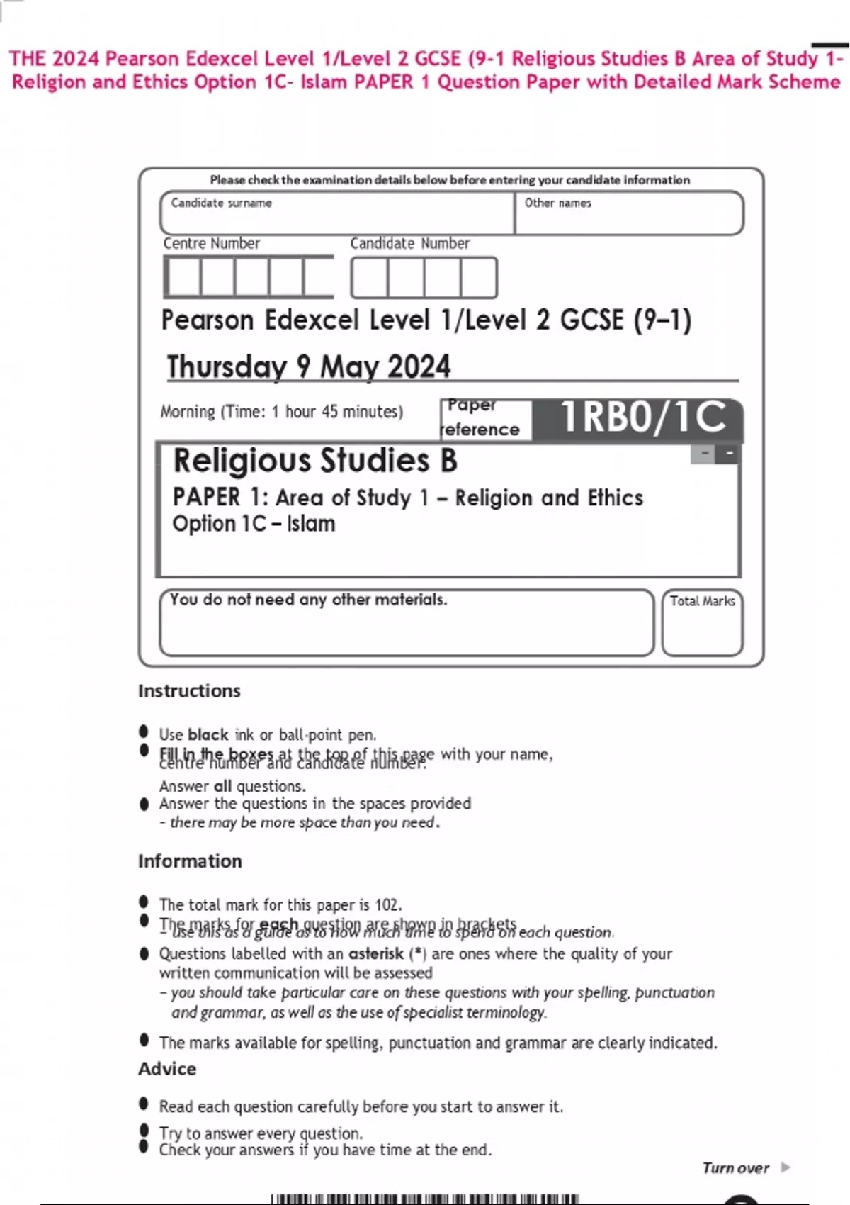 THE 2024 Pearson Edexcel Level 1/Level 2 GCSE (9-1 Religious Studies B Area of Study 1– Religion and Ethics Option 1C– Islam PAPER 1 Question Paper with Detailed Mark Scheme