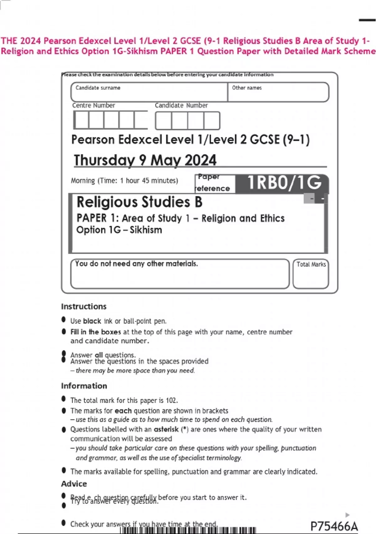THE 2024 Pearson Edexcel Level 1/Level 2 GCSE (9-1 Religious Studies B Area of Study 1– Religion and Ethics Option 1G-Sikhism PAPER 1 Question Paper with Detailed Mark Scheme