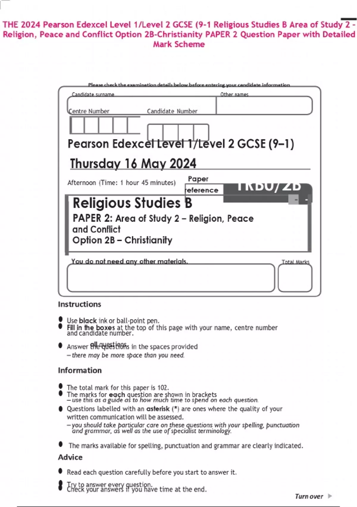 THE 2024 Pearson Edexcel Level 1/Level 2 GCSE (9-1 Religious Studies B Area of Study 2 – Religion, Peace and Conflict Option 2B-Christianity PAPER 2 Question Paper with Detailed Mark Scheme