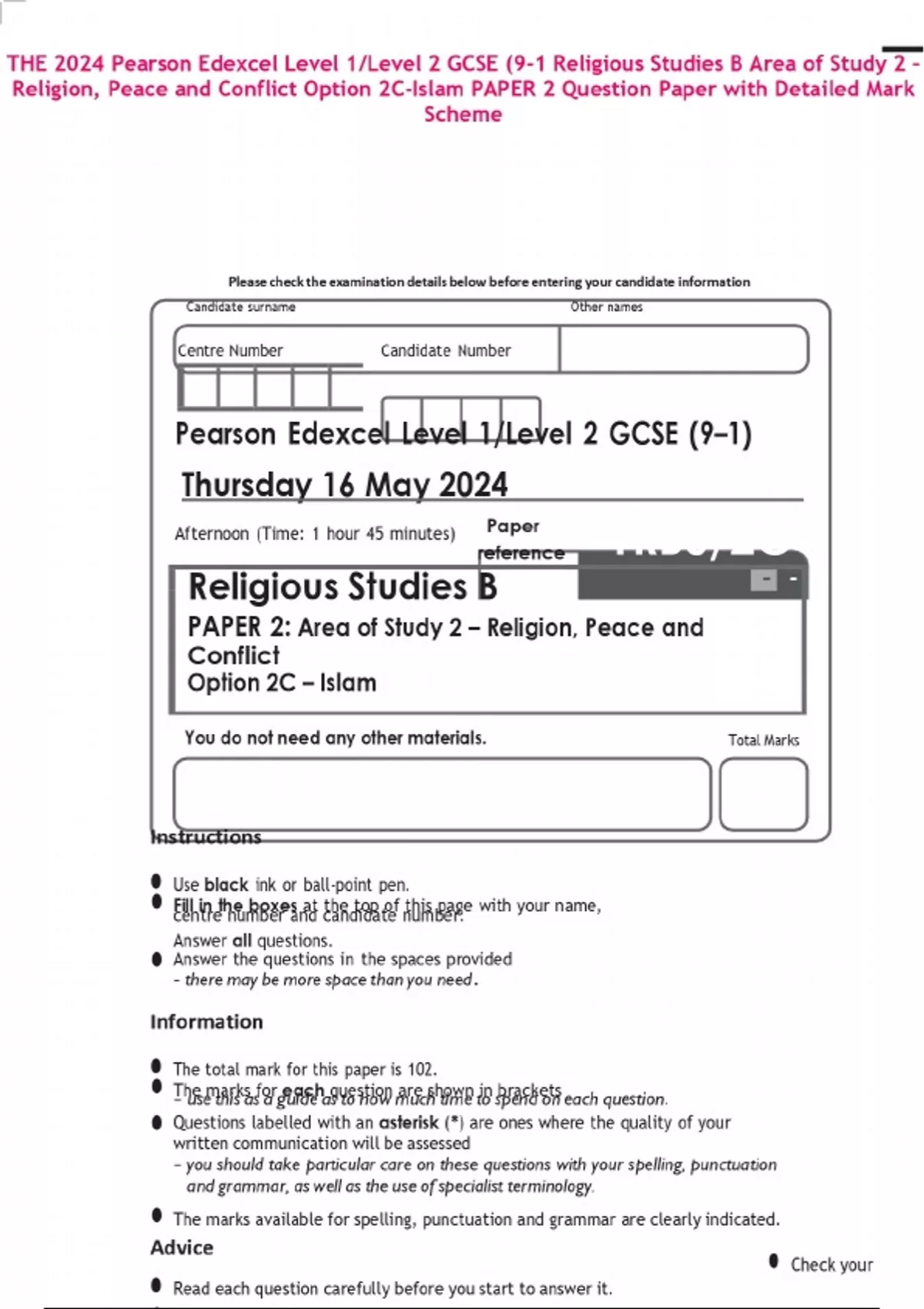 THE 2024 Pearson Edexcel Level 1/Level 2 GCSE (9-1 Religious Studies B Area of Study 2 – Religion, Peace and Conflict Option 2C-Islam PAPER 2 Question Paper with Detailed Mark Scheme