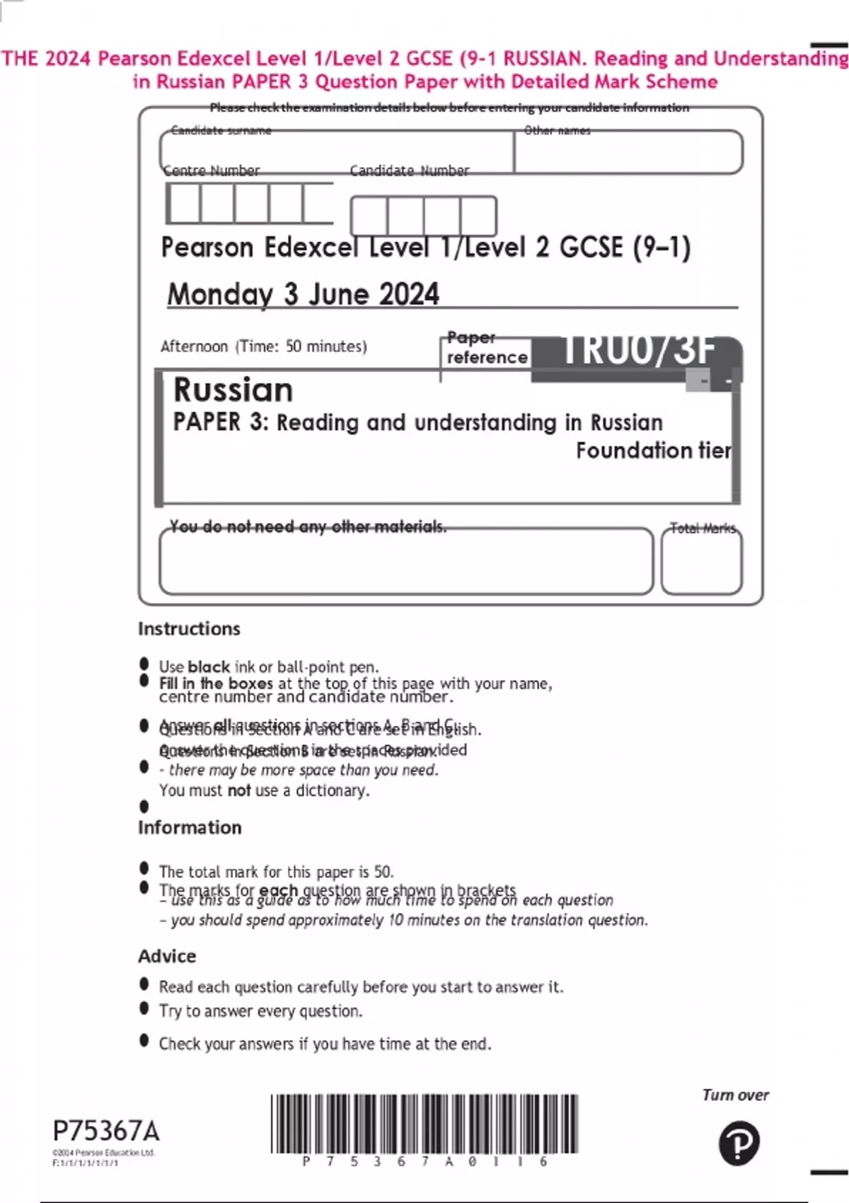 THE 2024 Pearson Edexcel Level 1/Level 2 GCSE (9-1 RUSSIAN. Reading and Understanding in Russian PAPER 3 Question Paper with Detailed Mark Scheme
