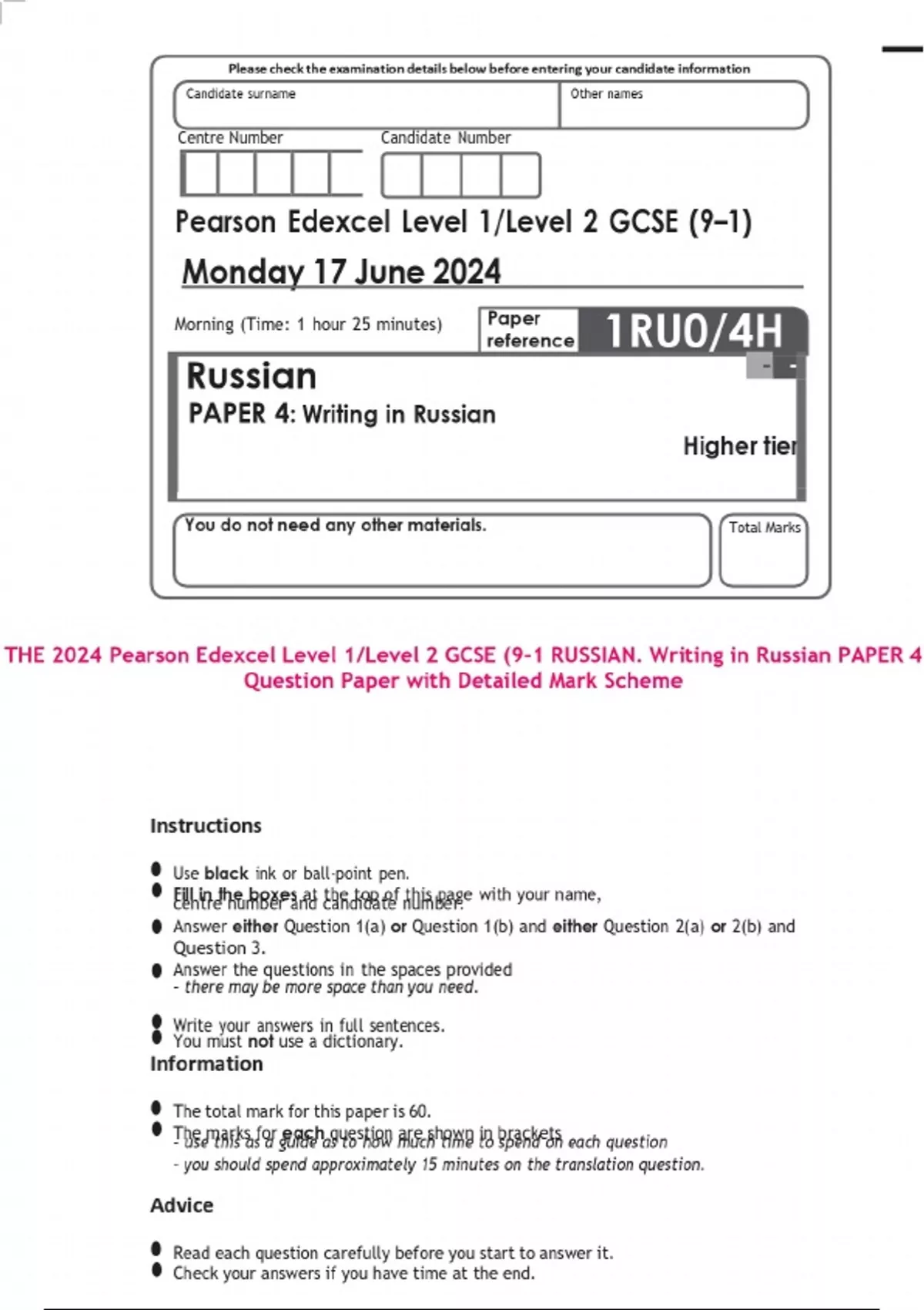 THE 2024 Pearson Edexcel Level 1/Level 2 GCSE (9-1 RUSSIAN. Writing in Russian PAPER 4 Question Paper with Detailed Mark Scheme