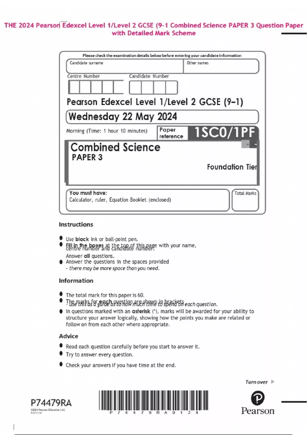 THE 2024 Pearson Edexcel Level 1/Level 2 GCSE (9-1 Combined Science PAPER 3 Question Paper with Detailed Mark Scheme