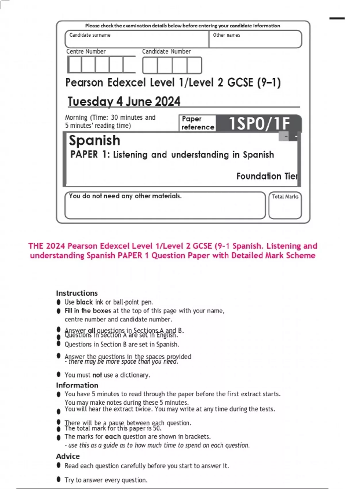 THE 2024 Pearson Edexcel Level 1/Level 2 GCSE (9-1 Spanish. Listening and understanding Spanish PAPER 1 Question Paper with Detailed Mark Scheme